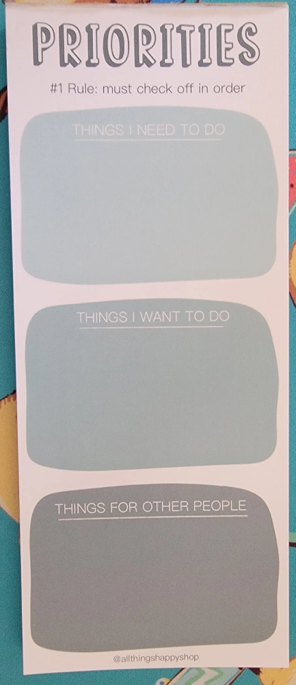 Get your tasks in order with this Priorities notepad from All Things Happy Shop! It helps you organize your to-do list by category: Things I Need To Do, Things I Want To Do, and Things for Other People.