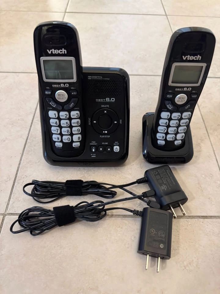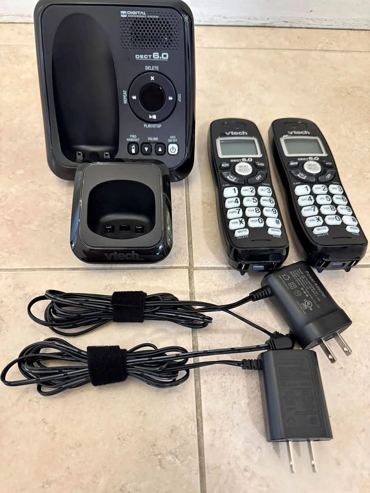 60Selling a used VTech cordless home phone system with two handsets and a digital answering machine. The system is in excellent condition and works perfectly. Condition: Used, but in excellent condition. Model: VTech CS6124-21 Included: Base unit with digital answering machine and two cordless handsets. Key Features: 30 name/number Caller ID memory (30 Phonebook memory) Green backlit keypad and display Volume control ROHS and Energy Star Compliant Memory-free NiMH Battery If this ad is still up, it is still available. This is a reliable and easy-to-use phone system for a home or small office.