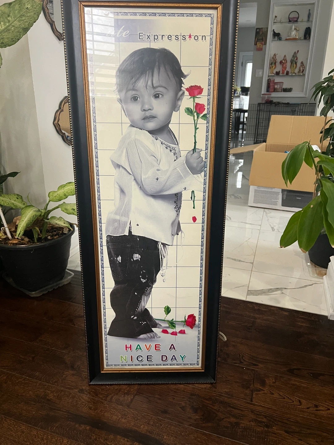 This is a framed photo featuring a baby holding a rose. The text "HAVE A NICE DAY" is at the bottom. It's in a black and gold decorative frame.