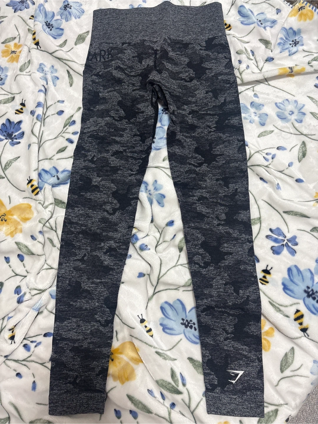 Gymshark camo seamless leggings. High-waisted design with a flattering fit. Fabric is a stretchy blend, perfect for workouts. Designed for comfort and performance. Pick up cash only