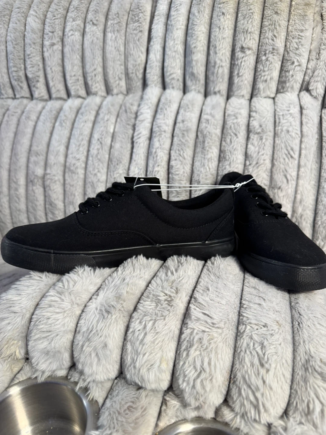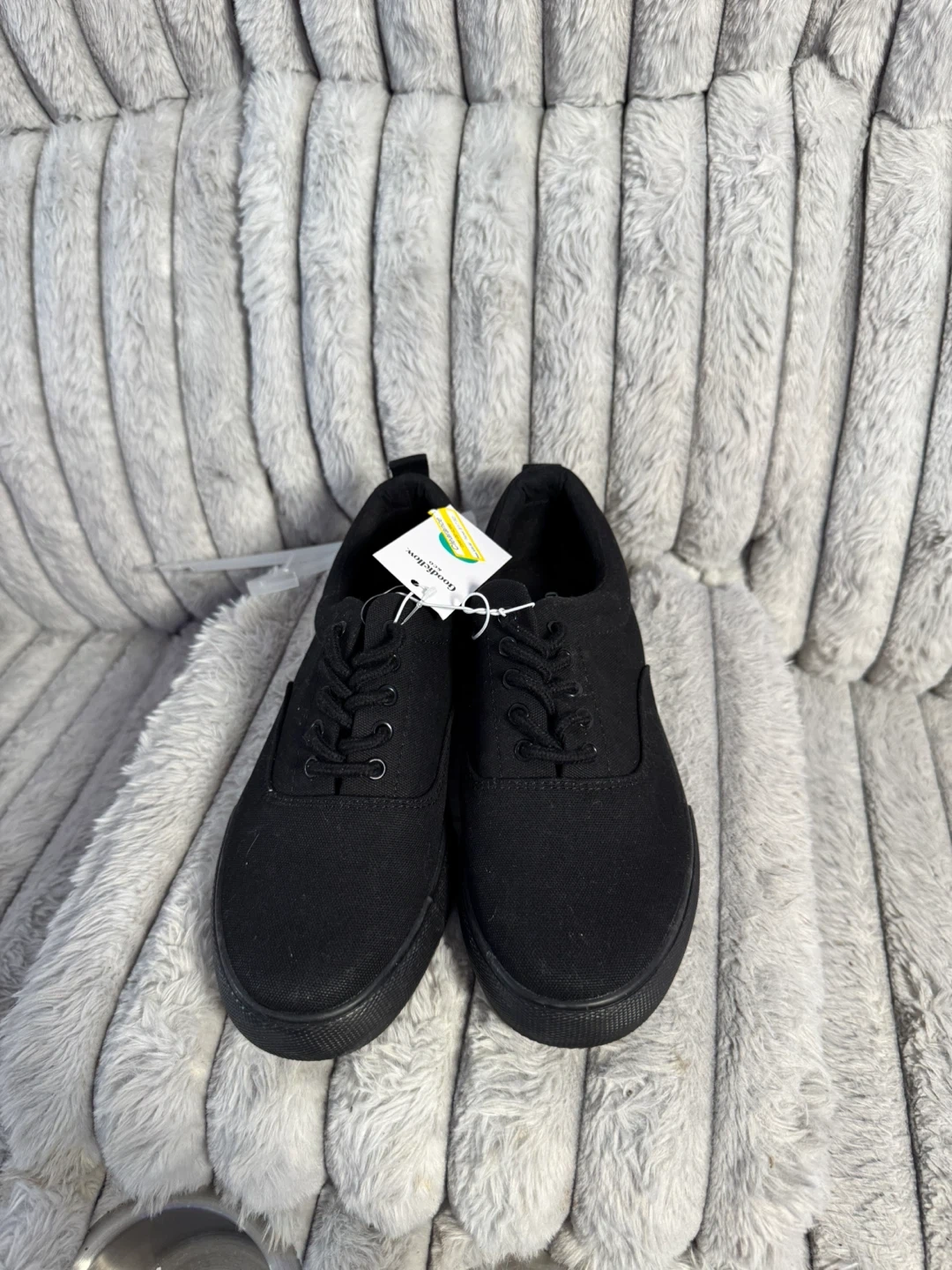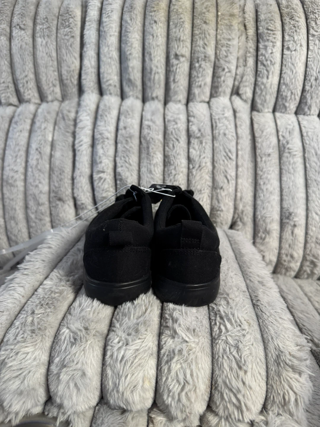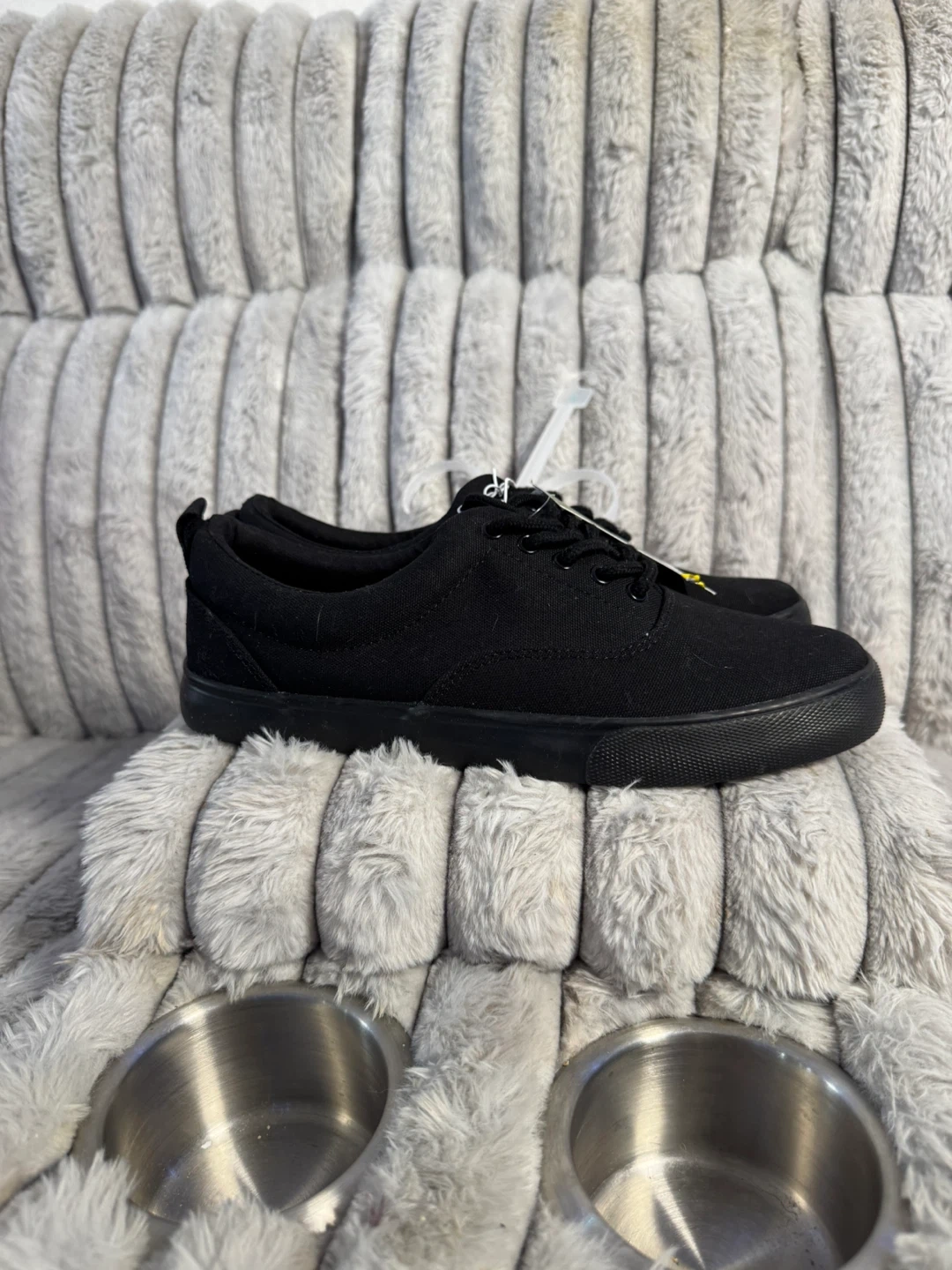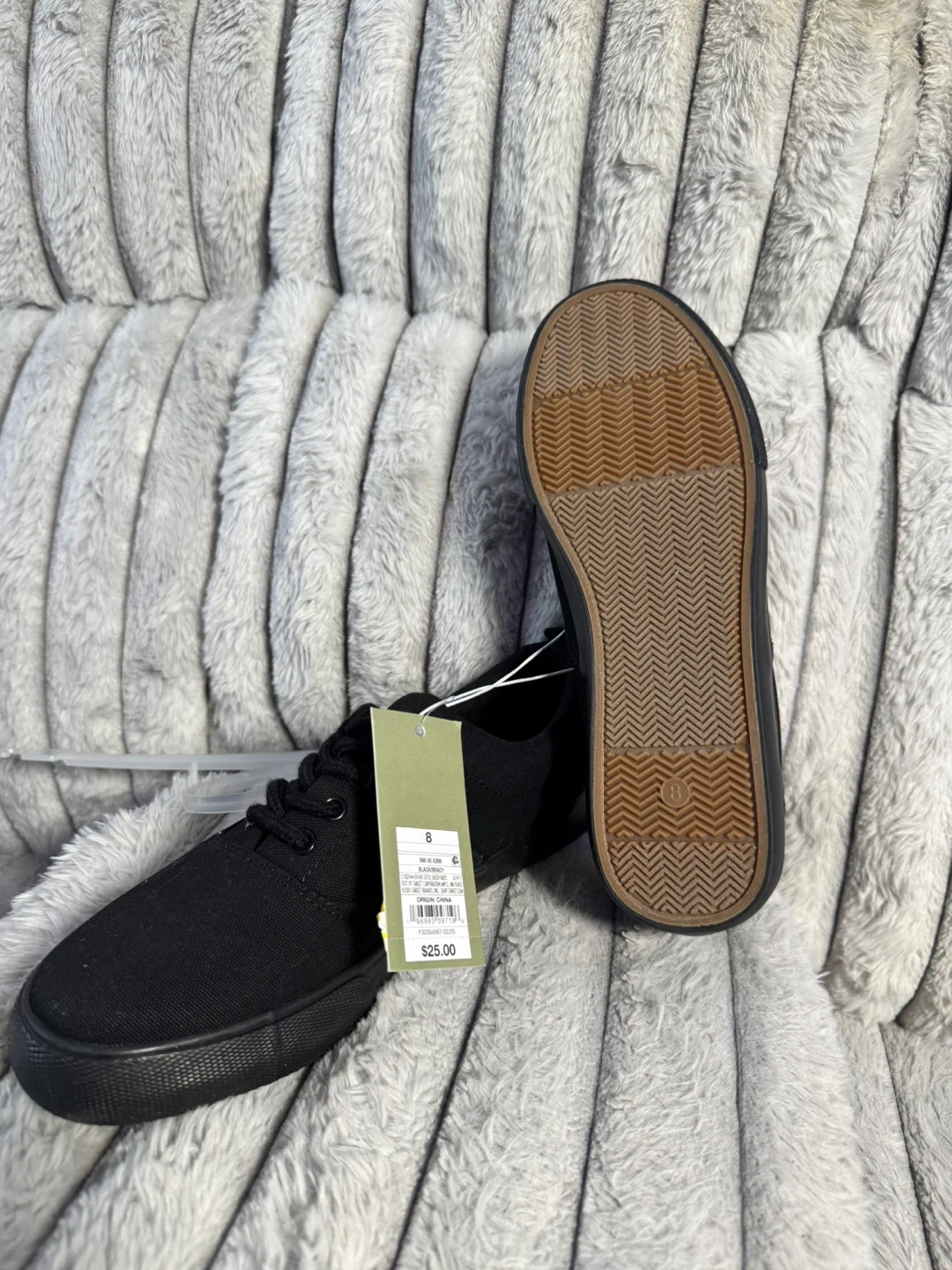 These are black canvas sneakers with a lace-up closure. They feature a durable rubber sole. These shoes are a size 8