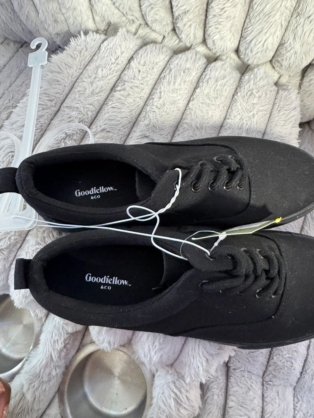 These are black canvas sneakers with a lace-up closure. They feature a durable rubber sole. These shoes are a size 8