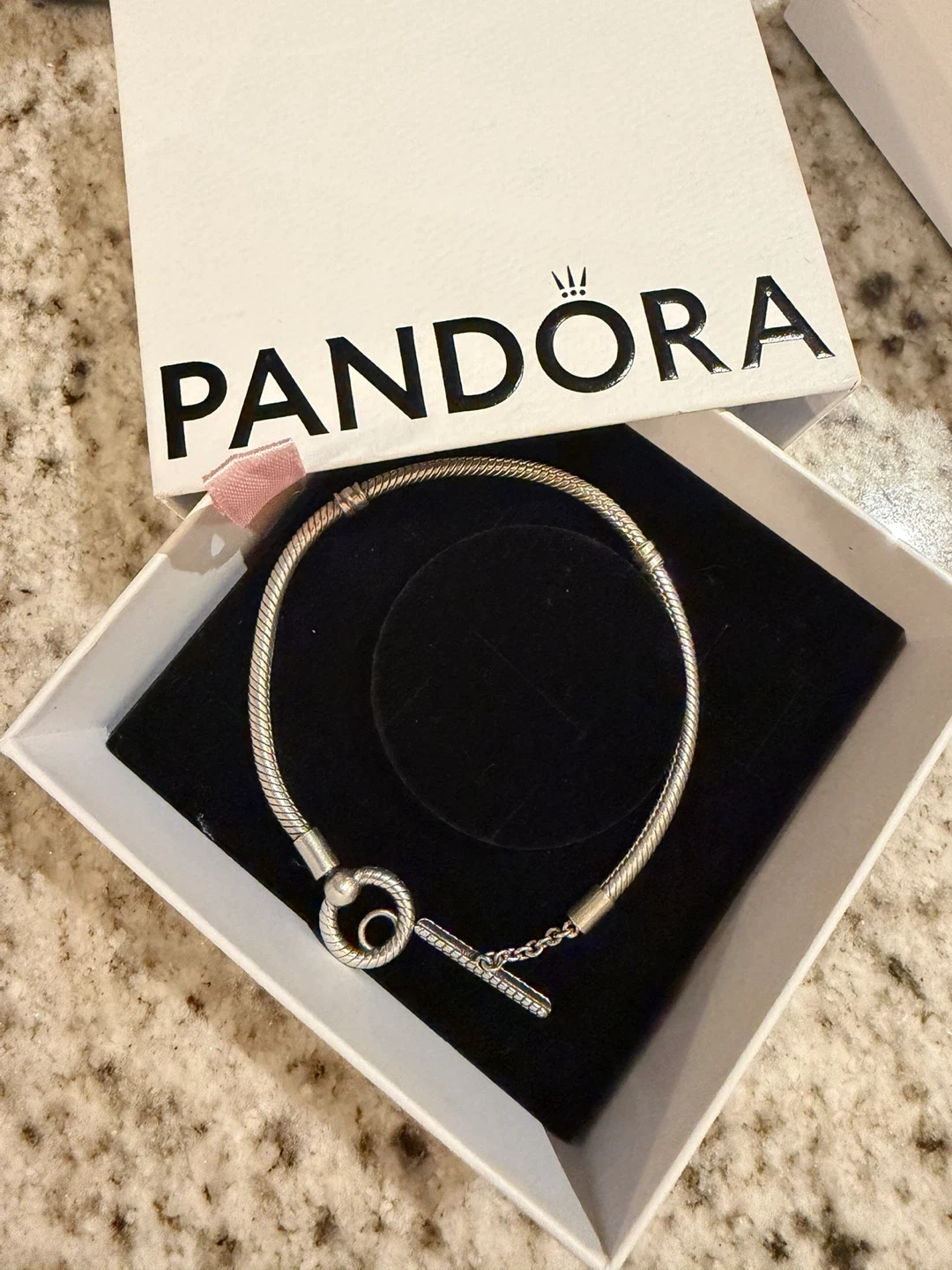 This Pandora bracelet is crafted from sterling silver and features a toggle clasp closure. It's a classic snake chain design. Comes with the original Pandora box. Add your favourite charms to personalize it!