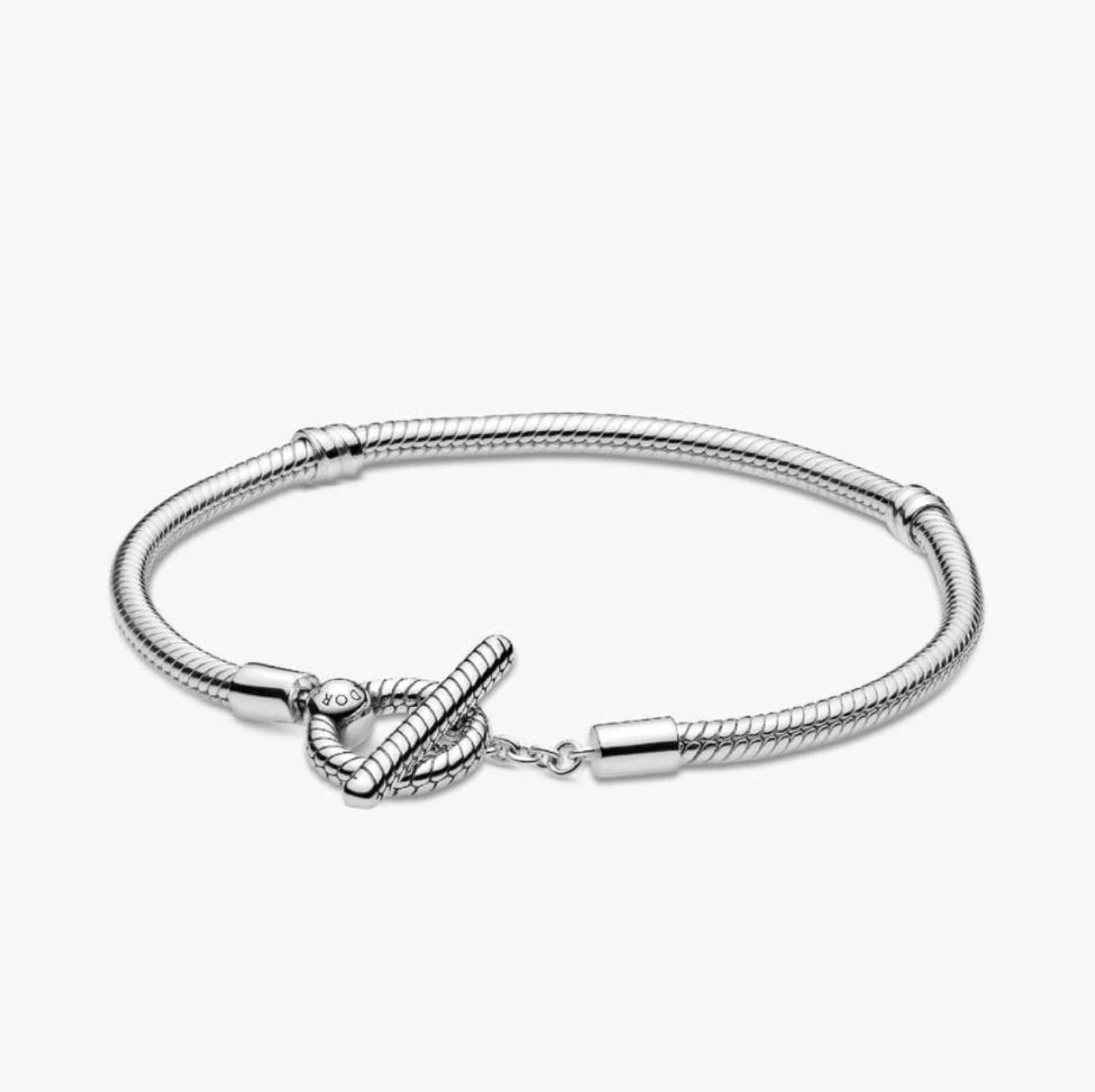 This Pandora bracelet is crafted from sterling silver and features a toggle clasp closure. It's a classic snake chain design. Comes with the original Pandora box. Add your favourite charms to personalize it!