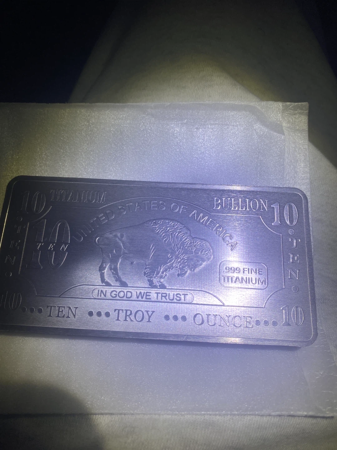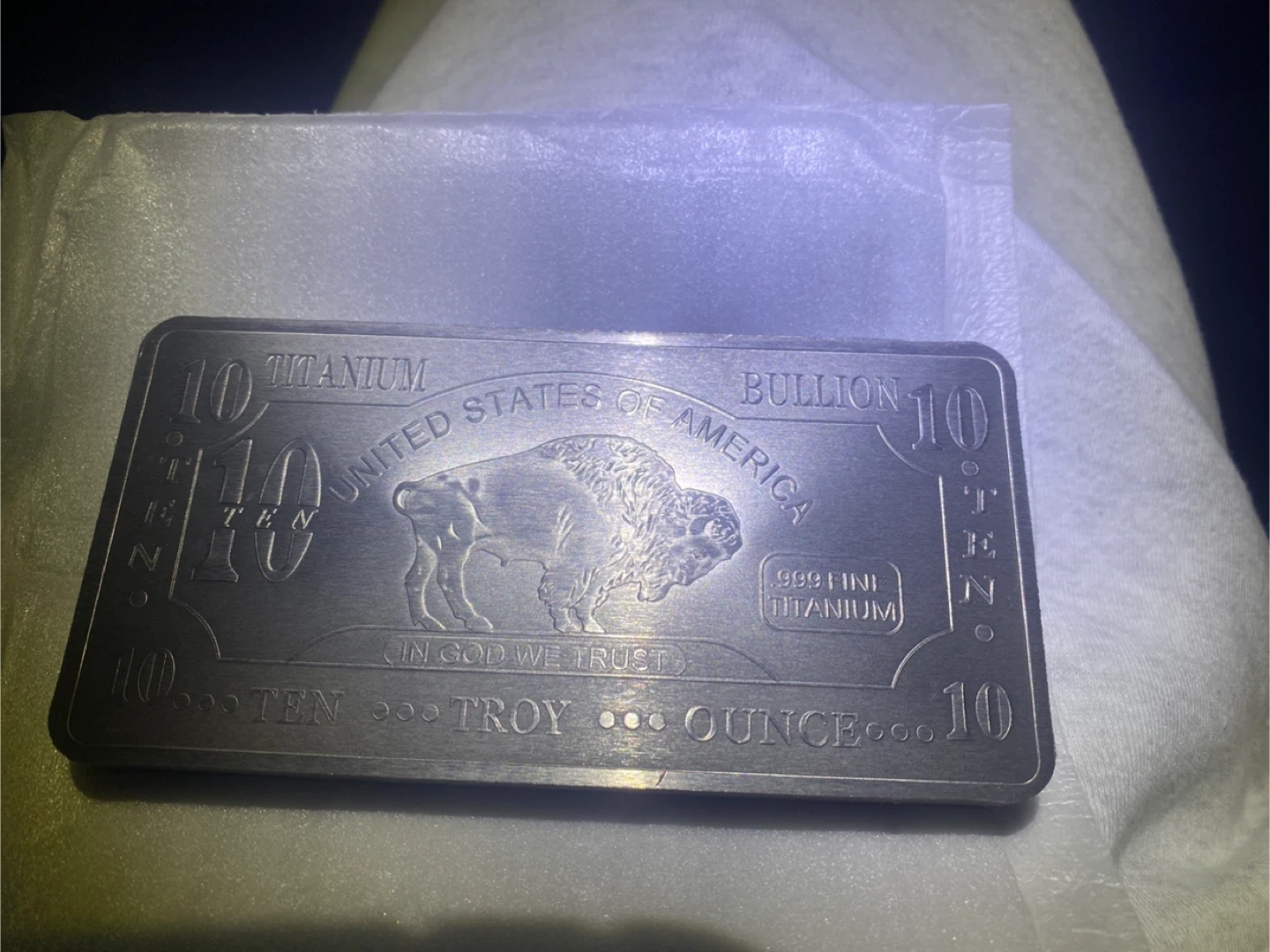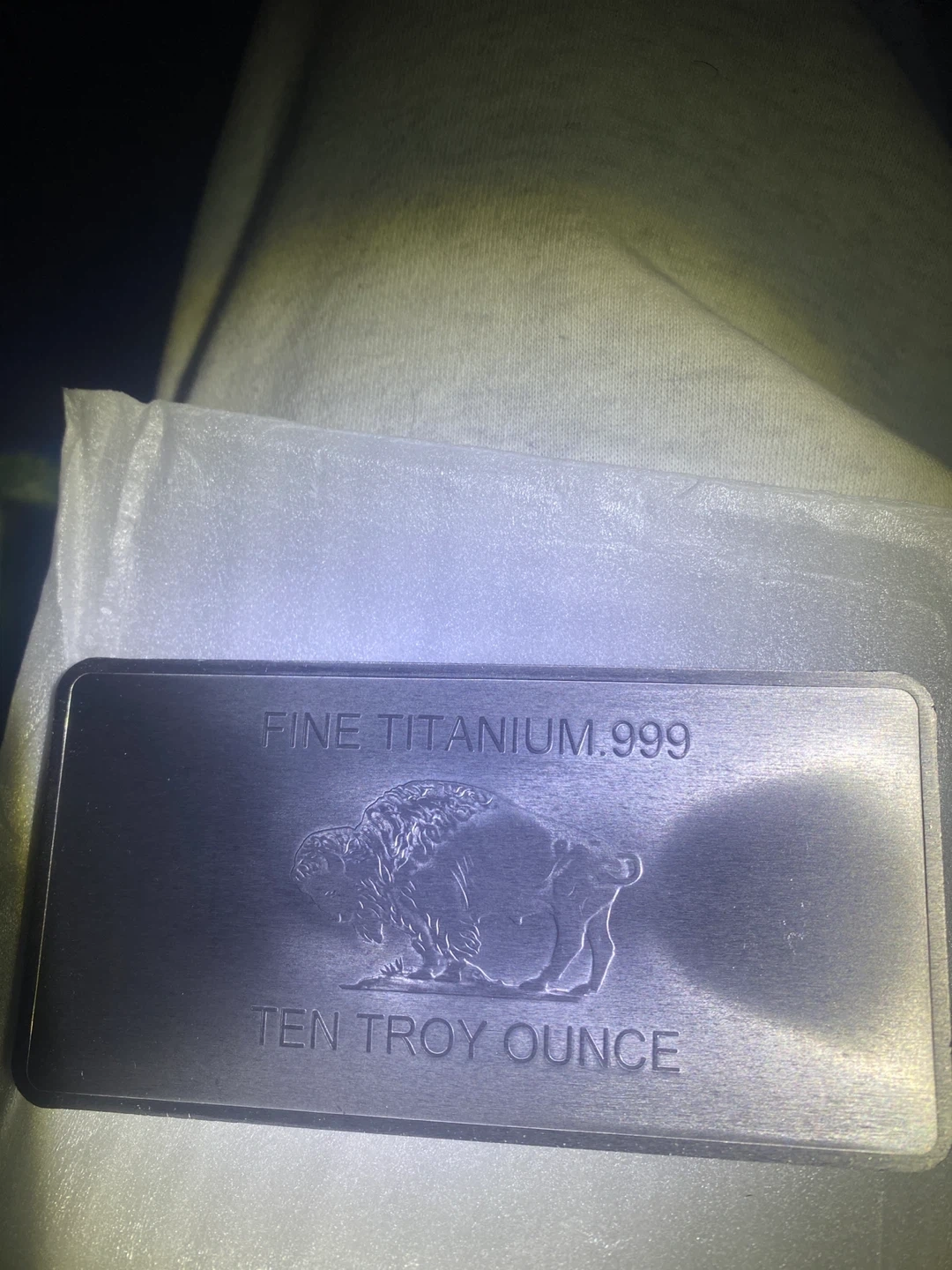 Buy & SellFine Titanium .999 Ten Troy Ounce BarFine Titanium .999 Ten Troy Ounce Bar$135Selling a fine titanium .999 bar. It's a ten troy ounce bullion bar featuring a buffalo design and "In God We Trust". It is made of titanium.WHERE TO MEETWebber GreensView MapSELLERverifiedKurtisStewart Greens690 reviews4 chats·2 favorites·228 viewsSEND CHAT TO SELLERHi Kurtis! I’m interested in your listing.Hi Kurtis! I’m interested in your listing.Get the Karrot app to chatSign In to chat