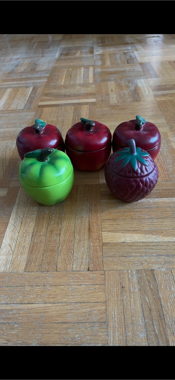 Charming set of five ceramic candle jars dishes shaped like fruits. Includes red apples and a green apple, plus a red strawberry dish. Great for holding small treasures or as decorative accents!