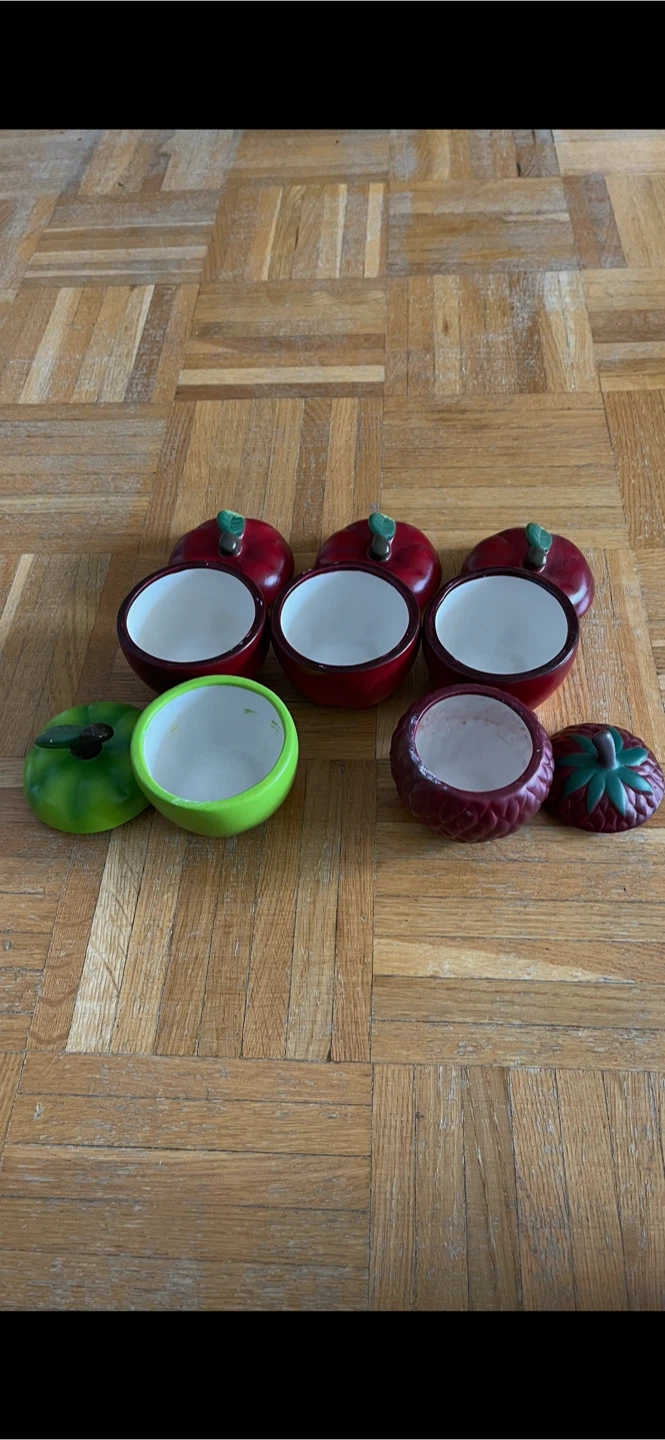 Charming set of five ceramic candle jars dishes shaped like fruits. Includes red apples and a green apple, plus a red strawberry dish. Great for holding small treasures or as decorative accents!