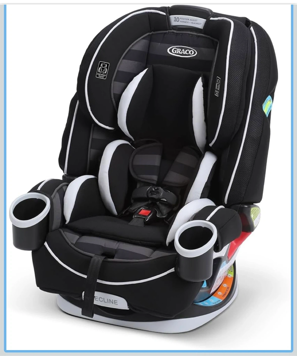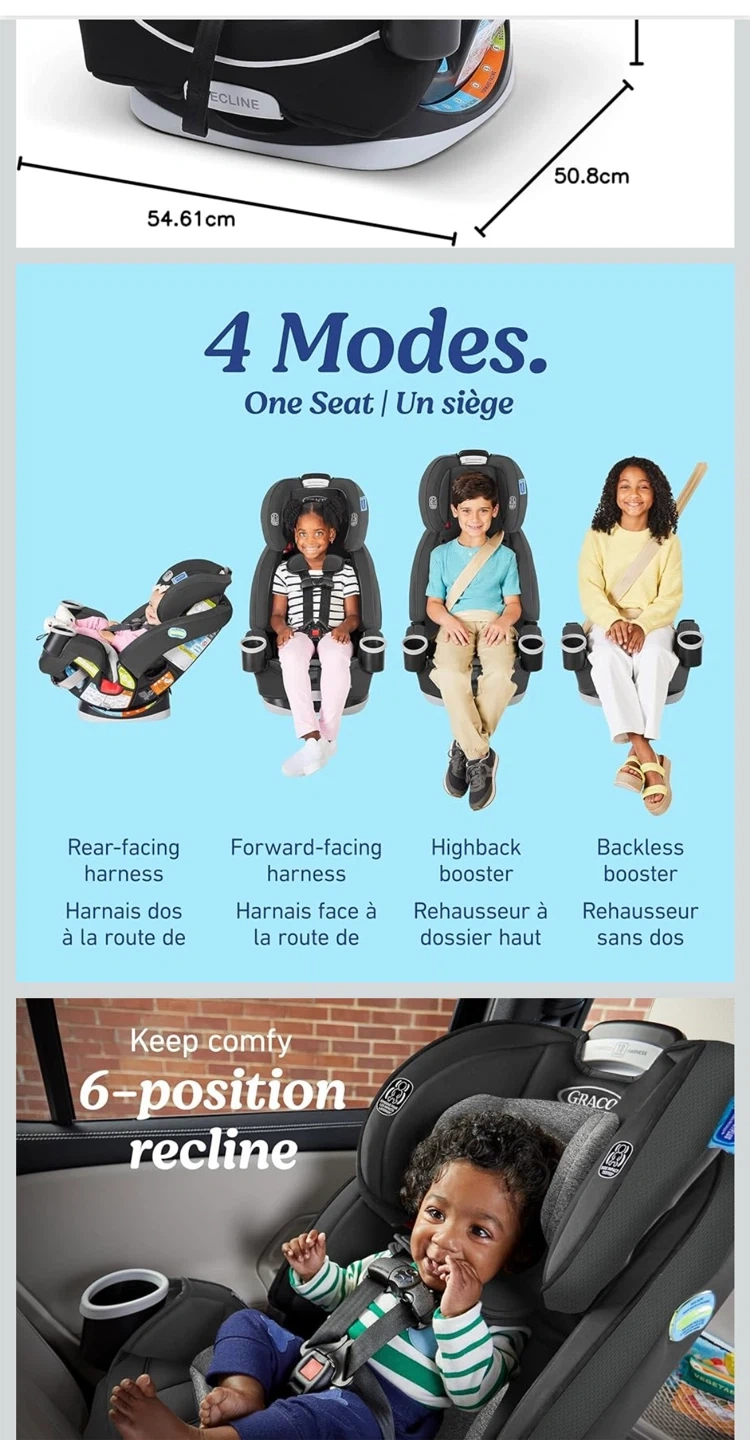 This Graco 4Ever DLX 4-in-1 Convertible Car Seat offers 4 modes of use, from a rear-facing harness to a backless booster. It has 6 recline positions for comfort. This seat is designed to grow with your child for 10 years. It features two cup holders.