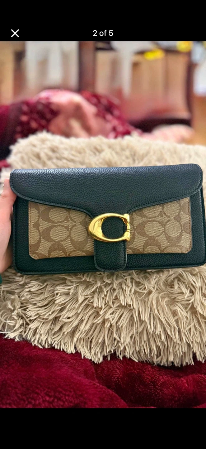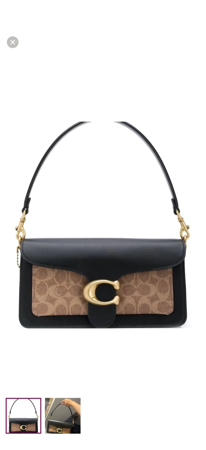 This is a Coach Tabby shoulder bag with signature C print. It includes a detachable crossbody strap and a dust bag. Leather and coated canvas material.