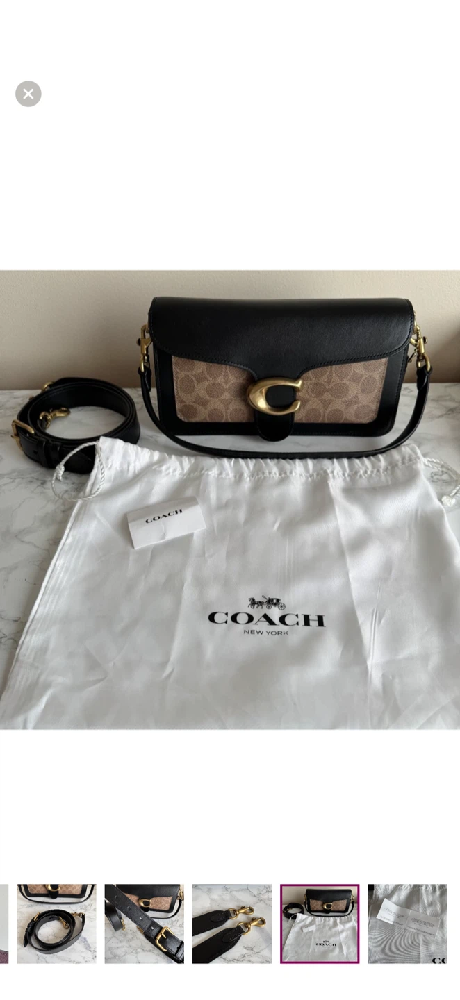 This is a Coach Tabby shoulder bag with signature C print. It includes a detachable crossbody strap and a dust bag. Leather and coated canvas material.