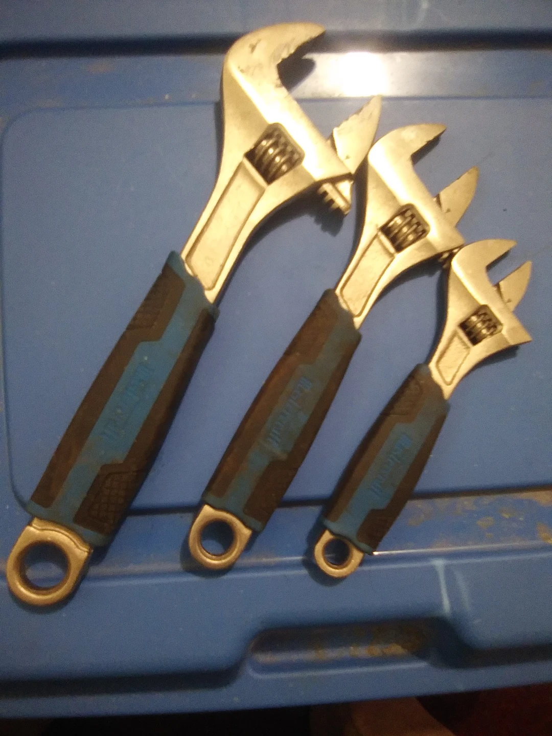 Mastercraft adjustable wrenches in a set of three. Features cushioned grips for comfort. Metal construction for durability. A useful set for various repair tasks!