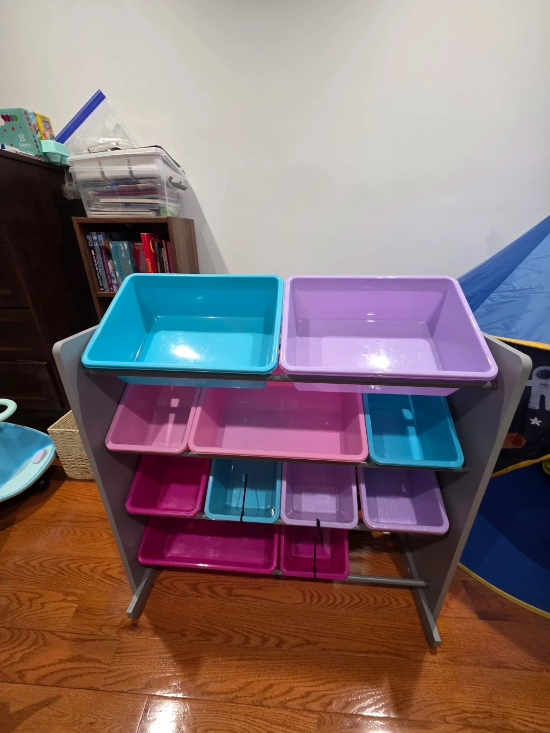 This toy organizer has a gray frame with multiple colorful bins. It features two large top bins in teal and lavender, with smaller pink, teal, and lavender bins below. This storage shelf is great for keeping toys tidy and accessible for children.