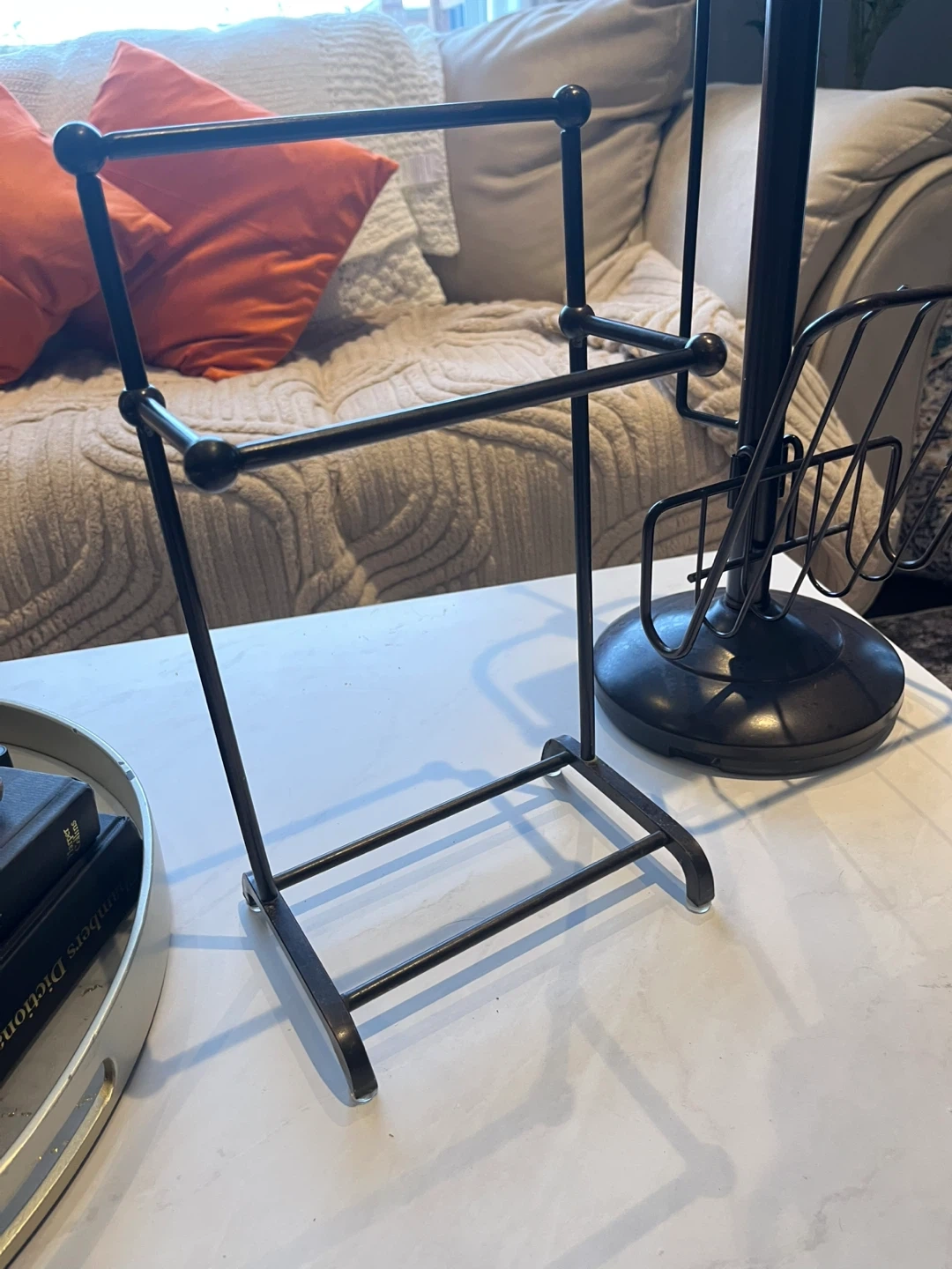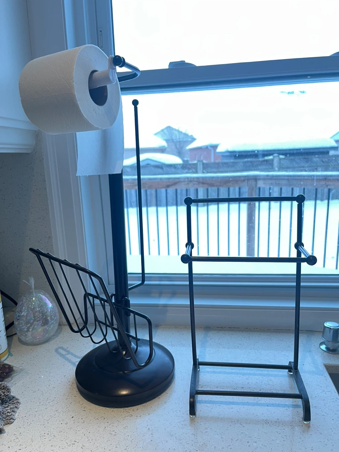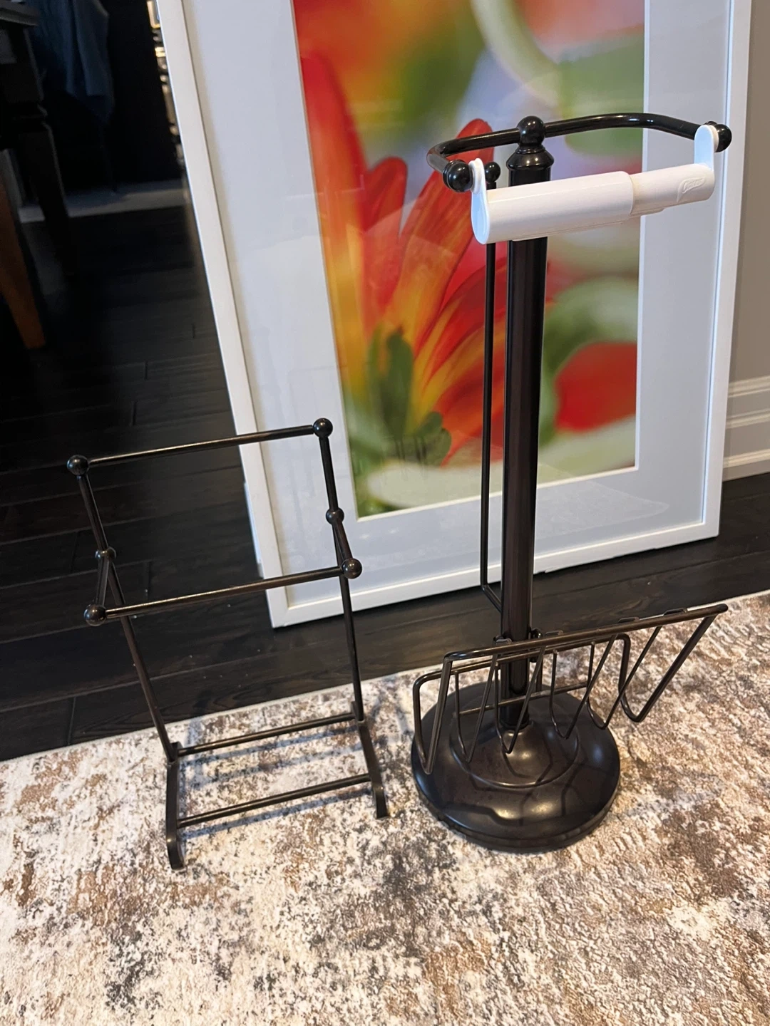 This floor-standing toilet paper holder comes with a built-in magazine rack. It's made of durable black metal. It also includes a small rack for an extra toilet paper roll.