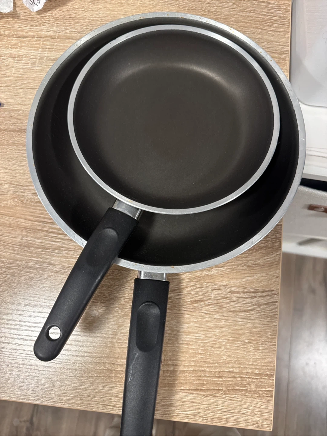 Selling a set of two non-stick frying pans. One pan is approximately 10 inches and the other is about 8 inches. They have black handles and are suitable for everyday cooking needs. These pans are useful for frying eggs, sautéing vegetables, or cooking small meals.