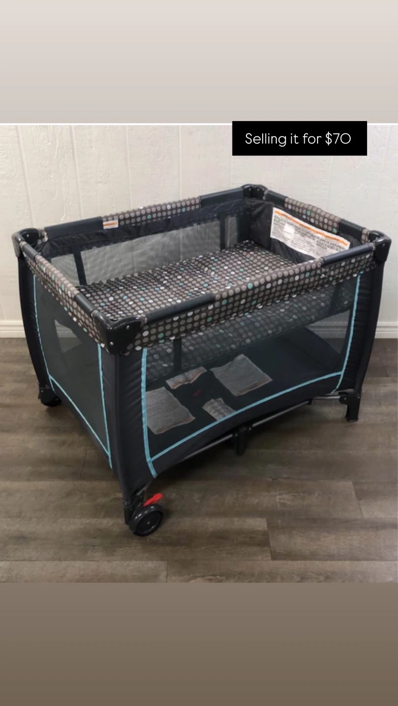 Playpen with wheels. Grey and blue polka dot pattern. Includes a mattress.