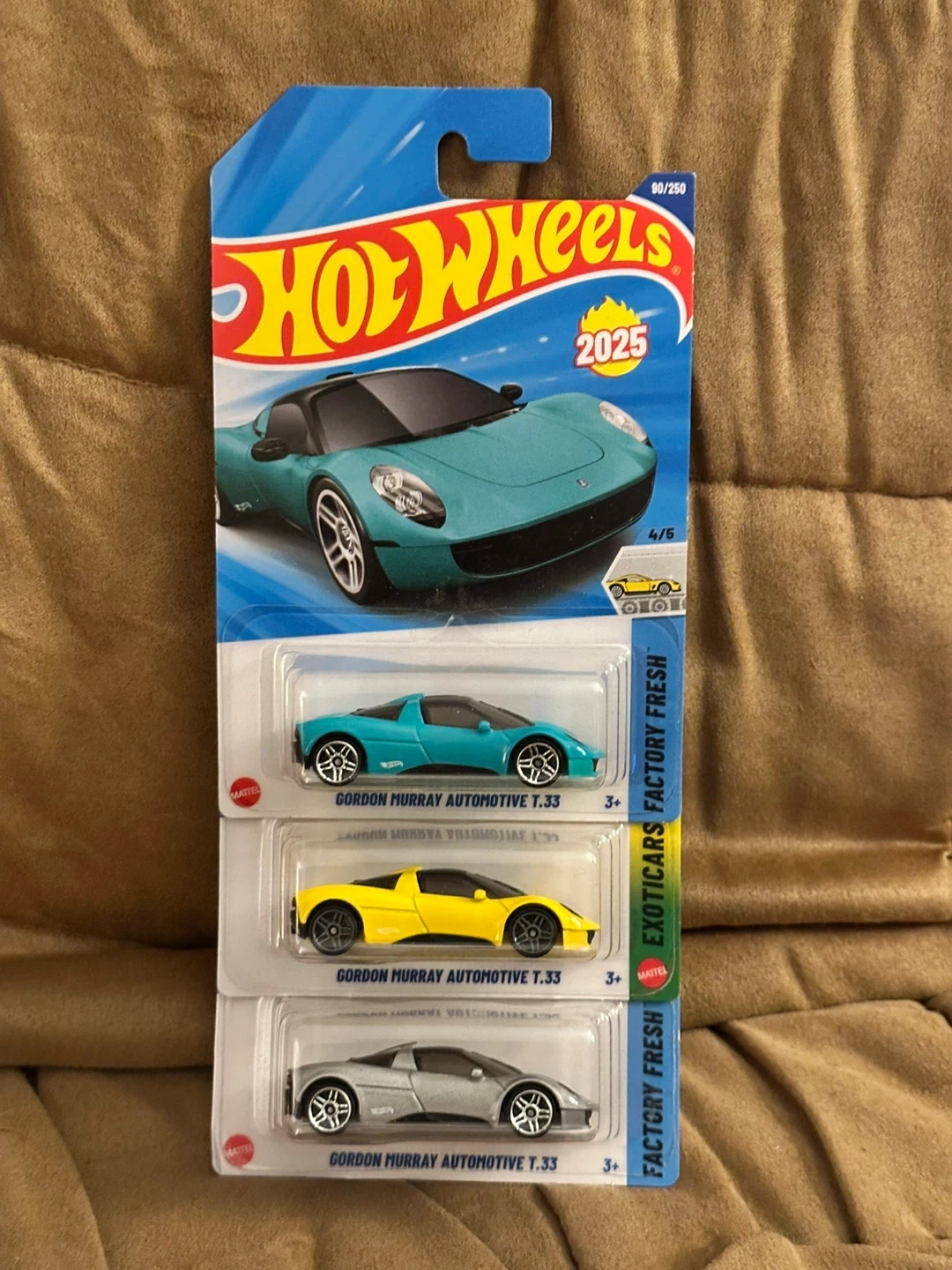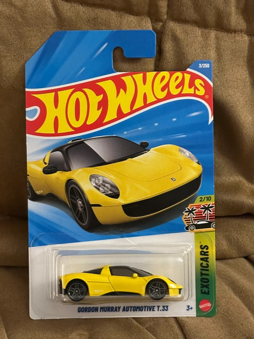 A new Hot Wheels die-cast car featuring the Gordon Murray Automotive T.33. It's part of the 2025 collection, carded and ready to go! This miniature car is a great addition for collectors or for playtime fun.