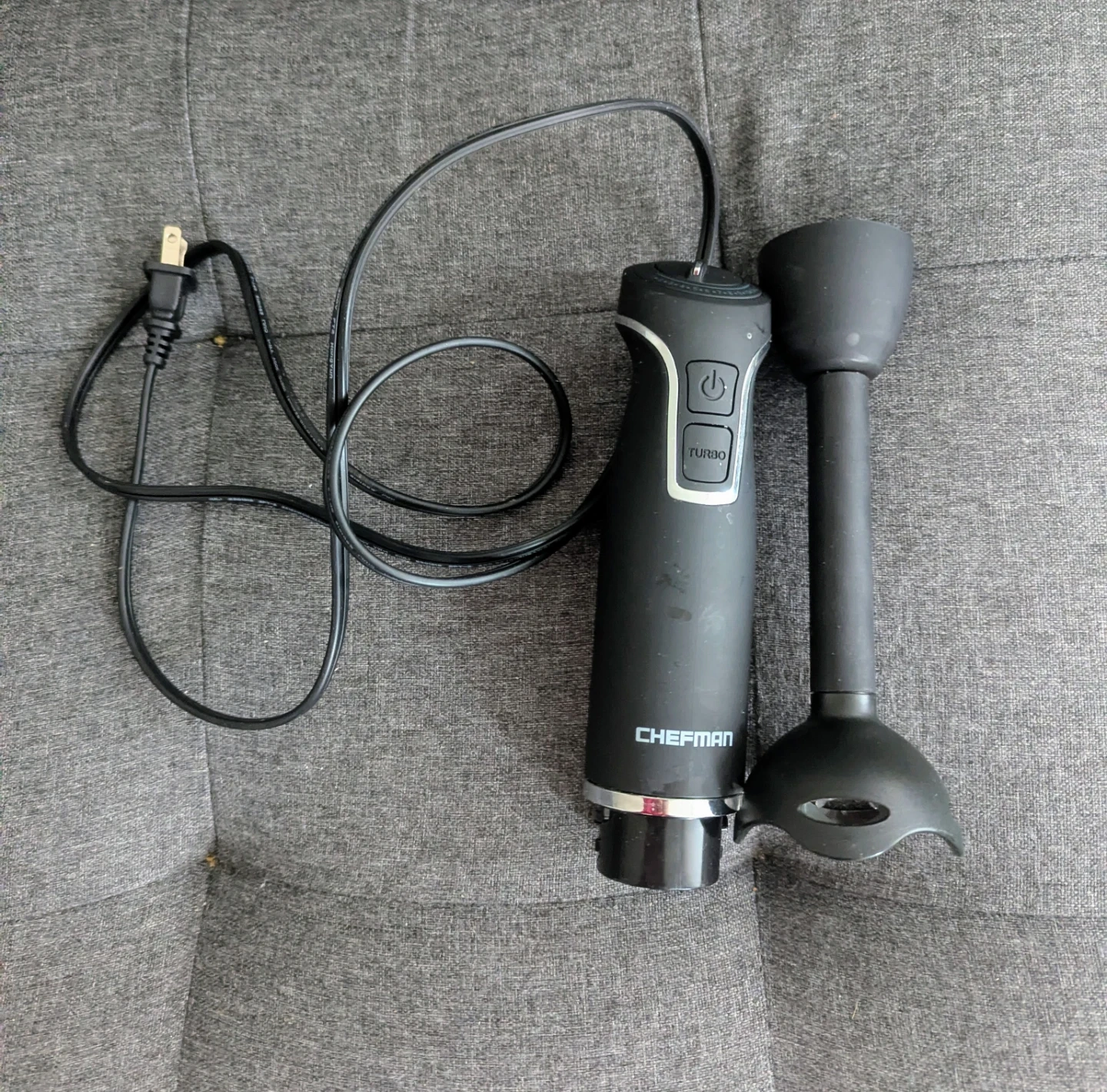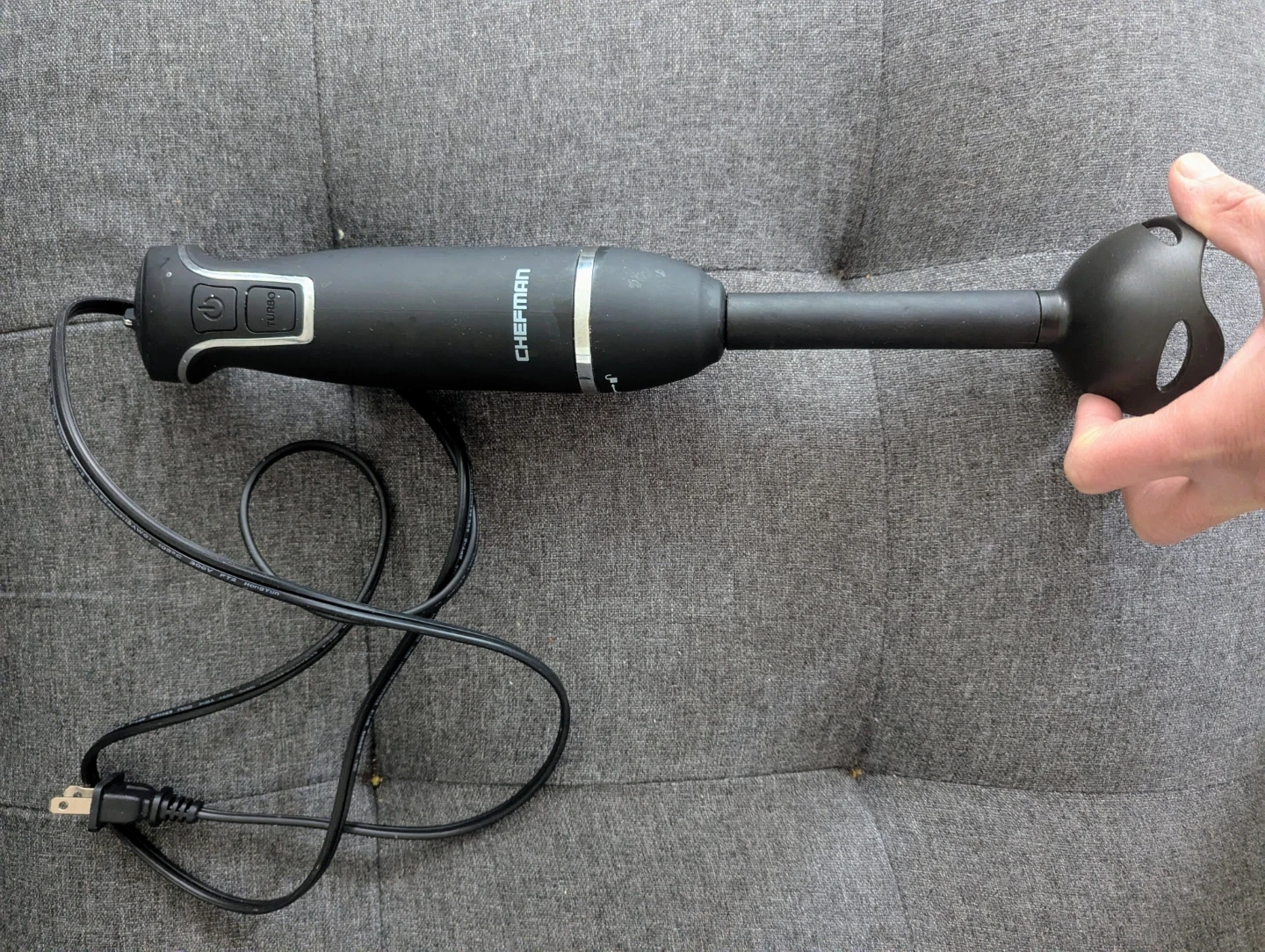 This is a black Chefman hand blender. It features a turbo button for extra power. The immersion blender attachment is included.