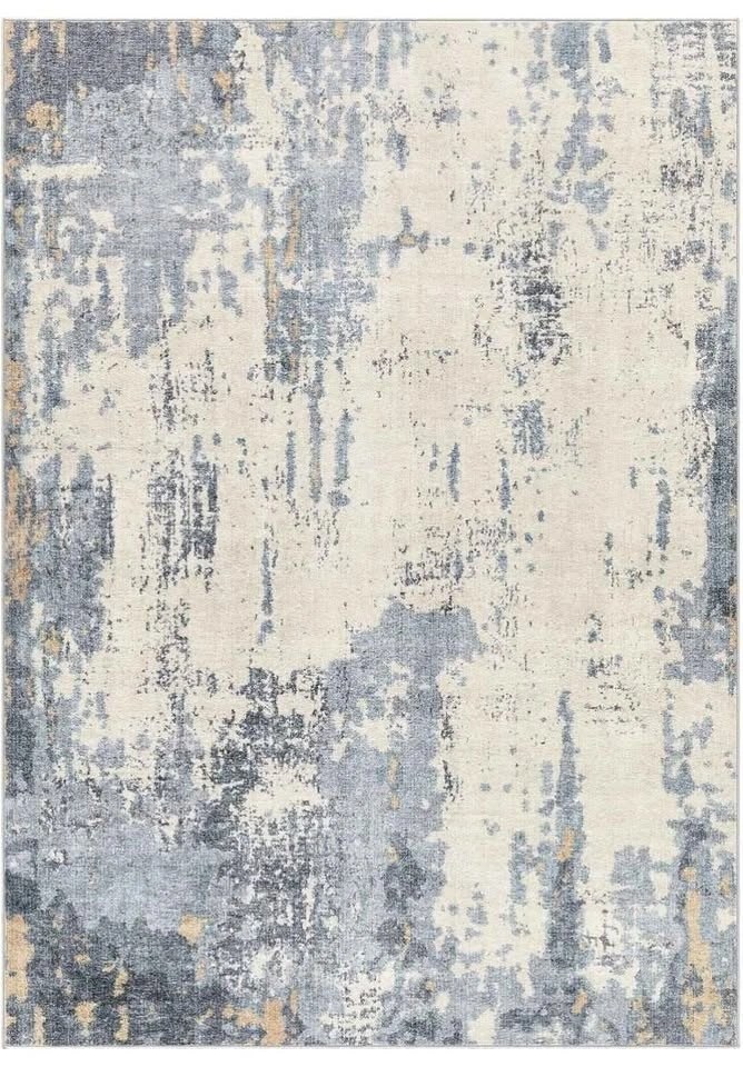 Brand new 8x10 area rug. Perfect for living room, bedroom, home office, or under a dining table. Features a neutral, modern abstract design in blue and light brown. Soft and thin with a no-slip backing.