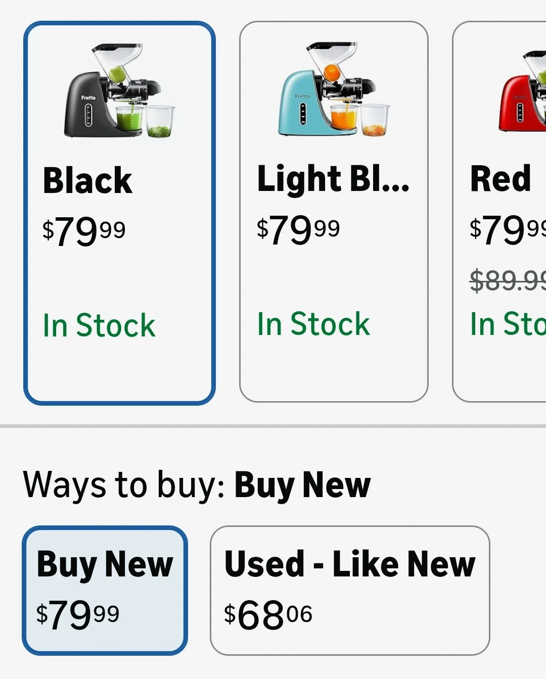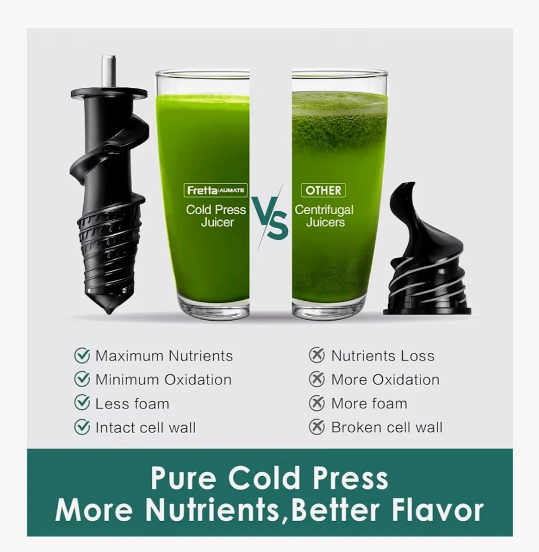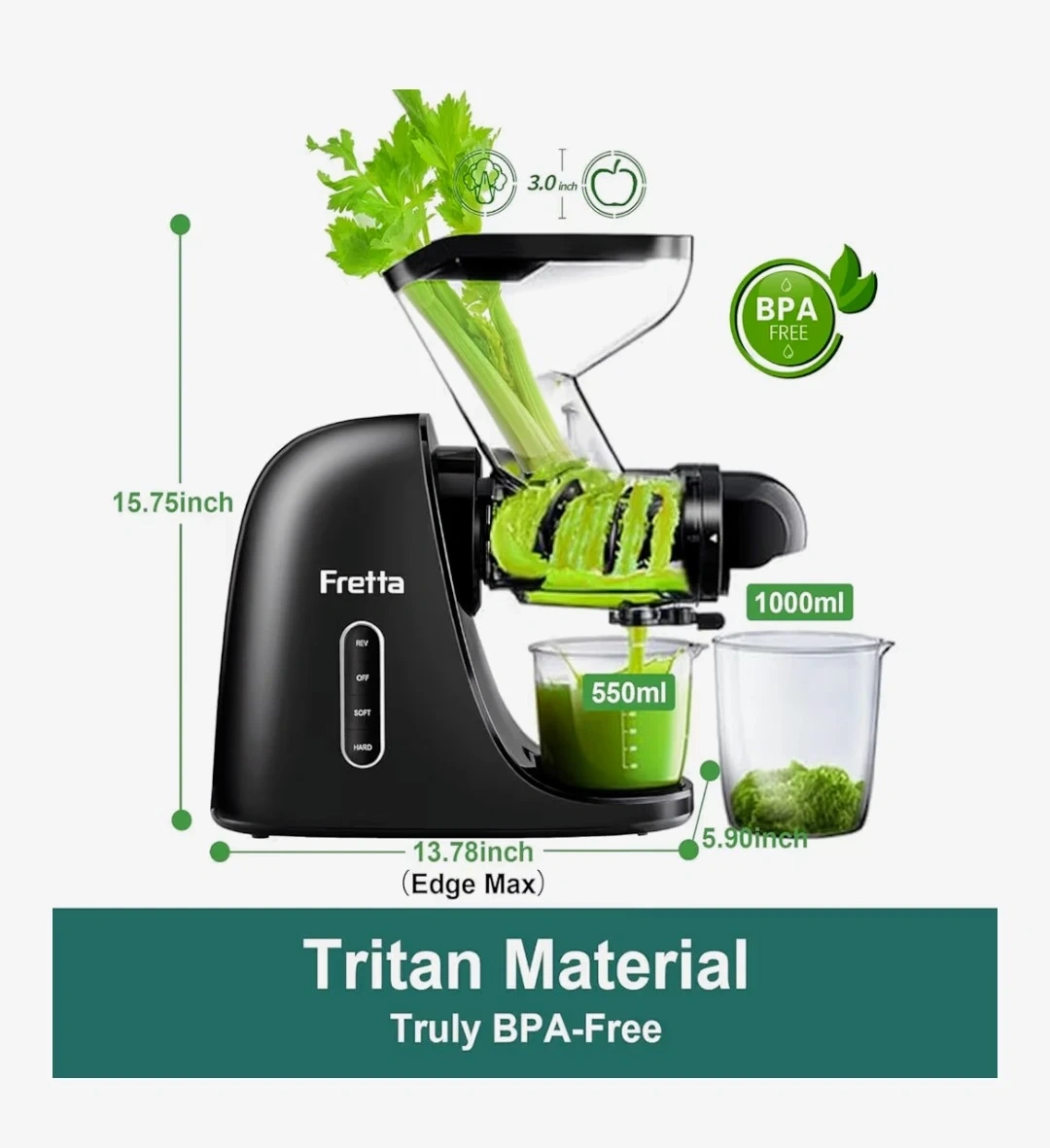 Selling a Fretta Juicer Machine in black! It features a 3" wide feed chute, so you can fit whole fruits. It's a cold press juicer designed for high juice yield and is BPA free. The juicer is made with Tritan material. It measures 15.75 inches tall and 13.78 inches wide.