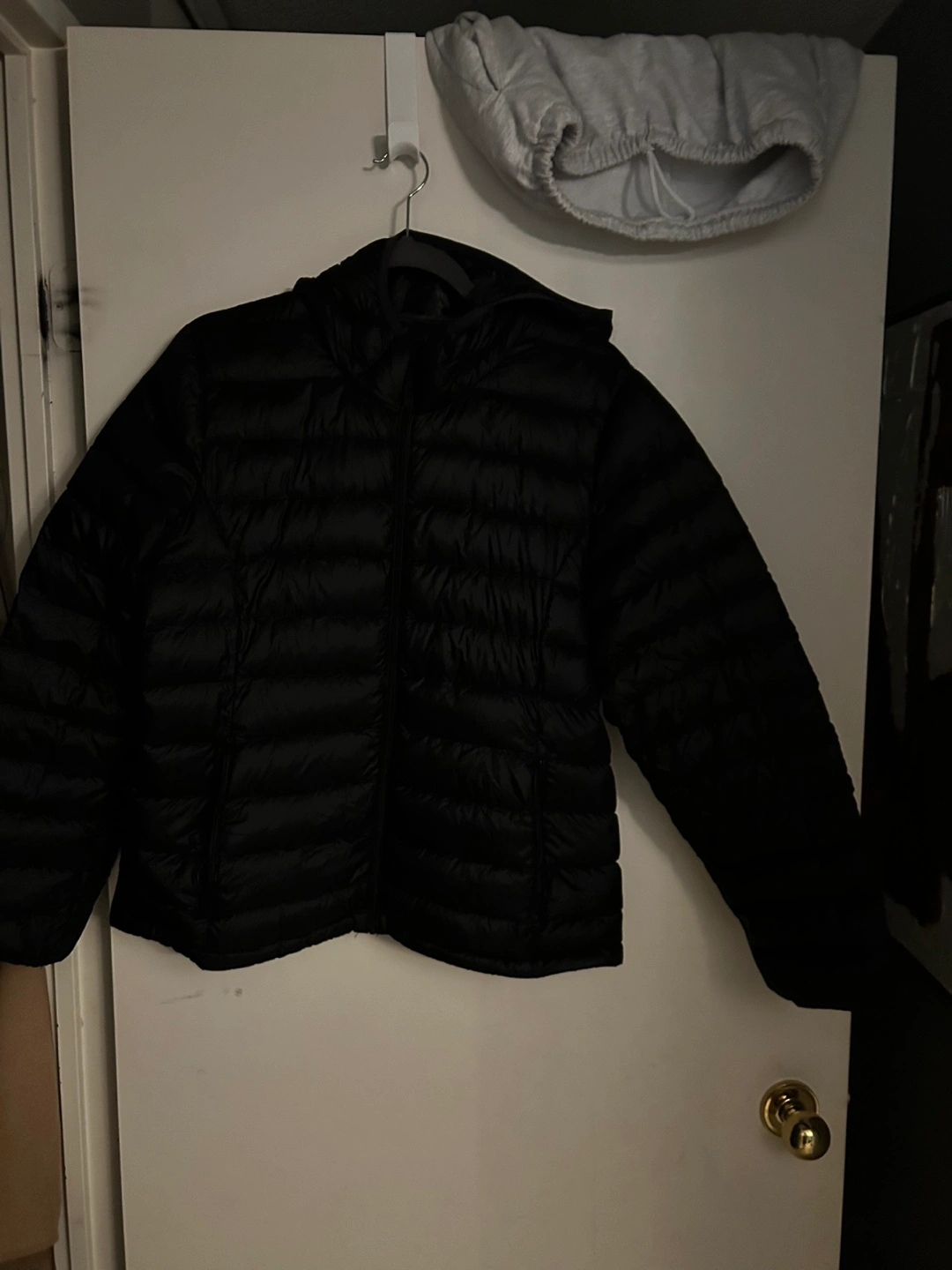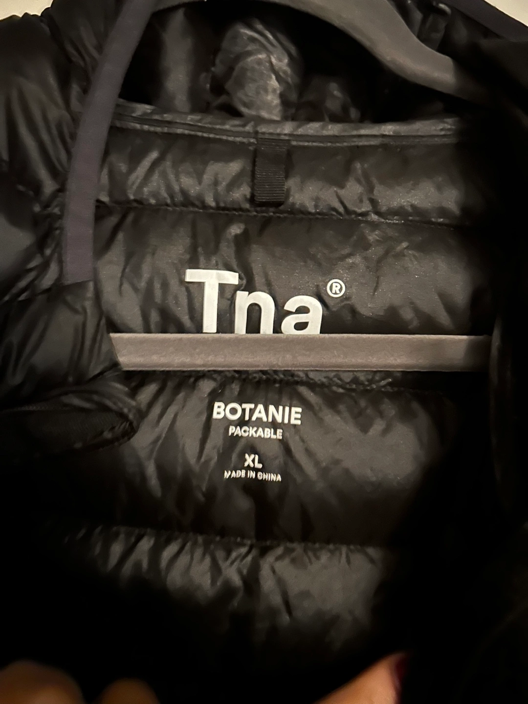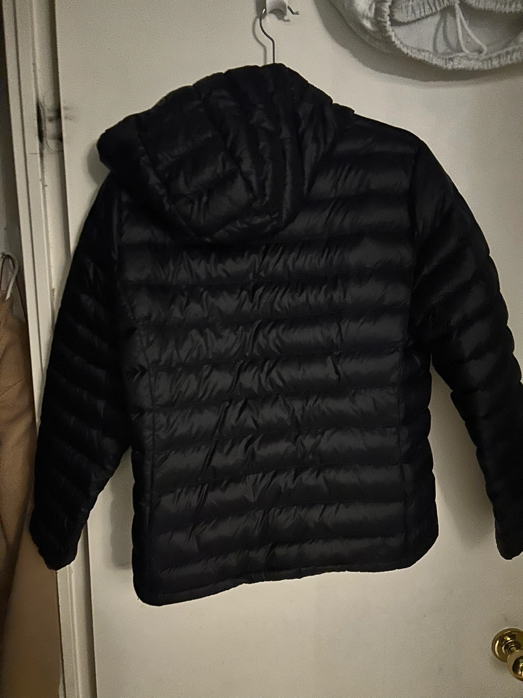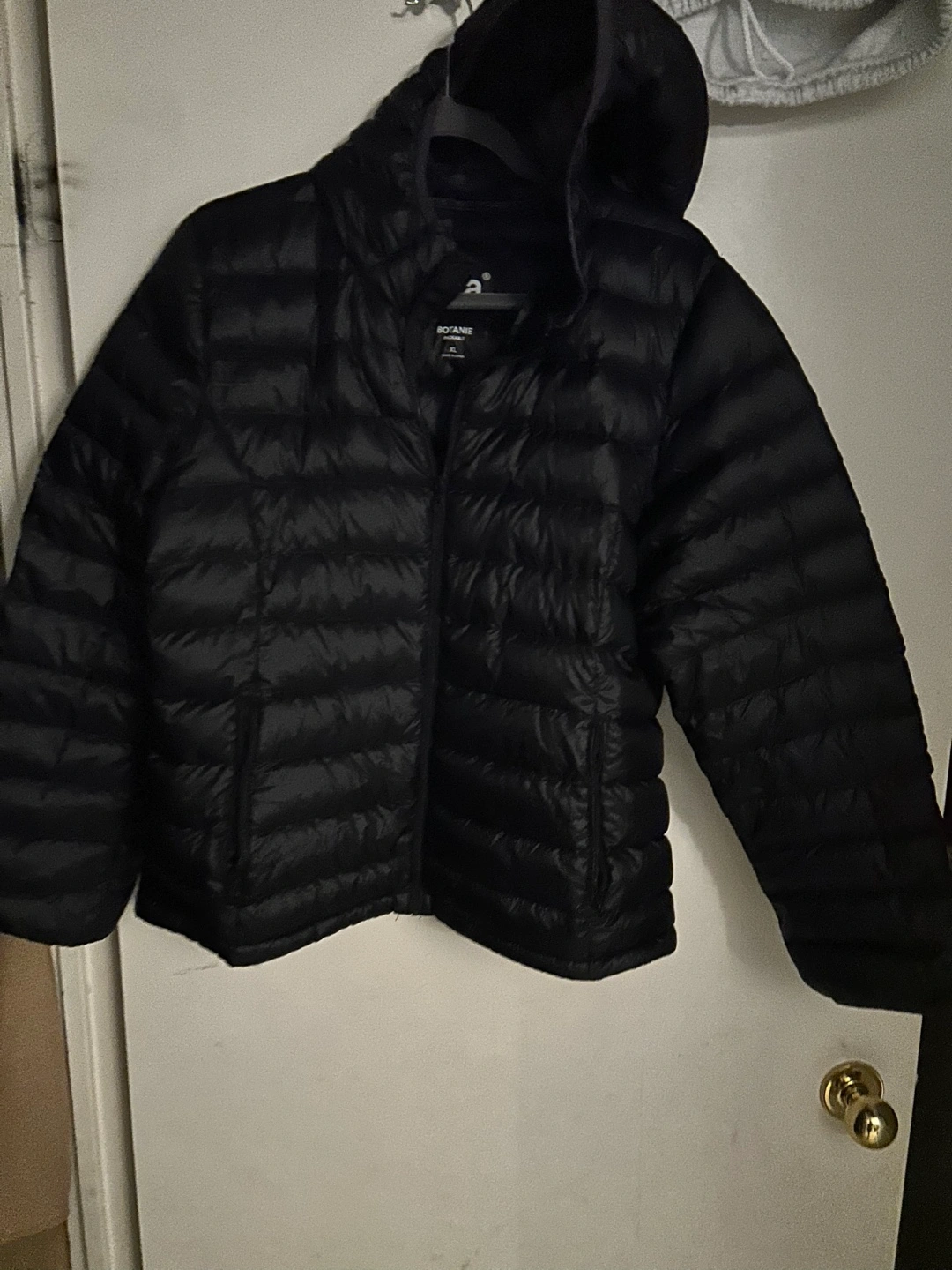Black packable down jacket. Size XL. Features a hood and zipper closure.