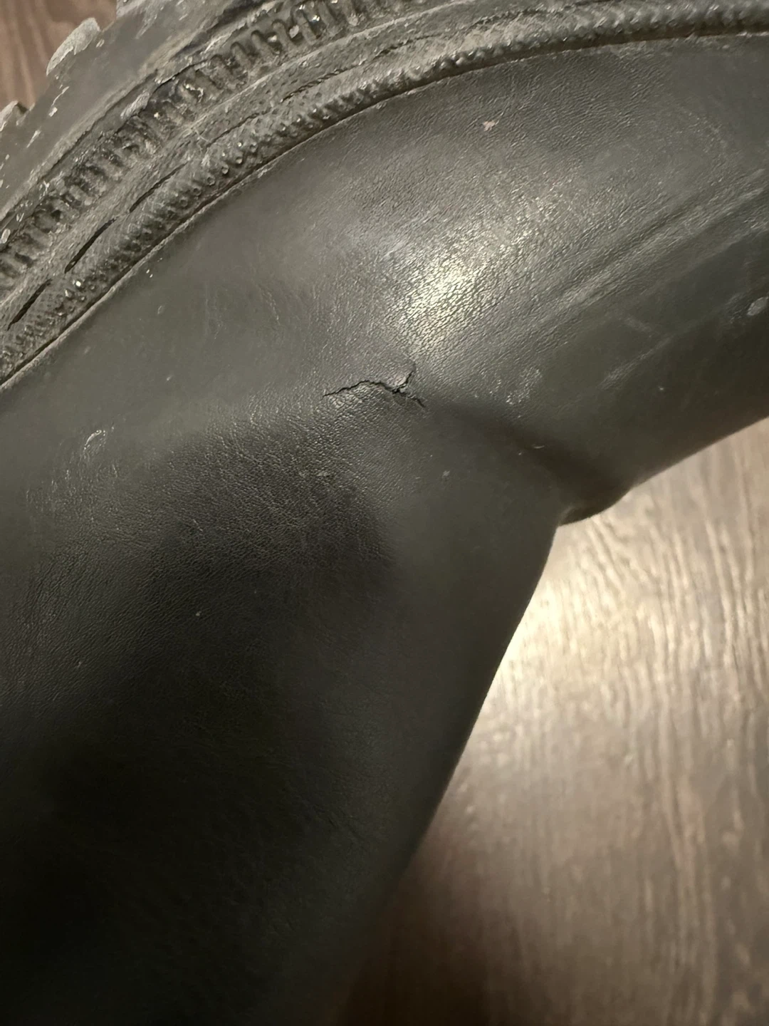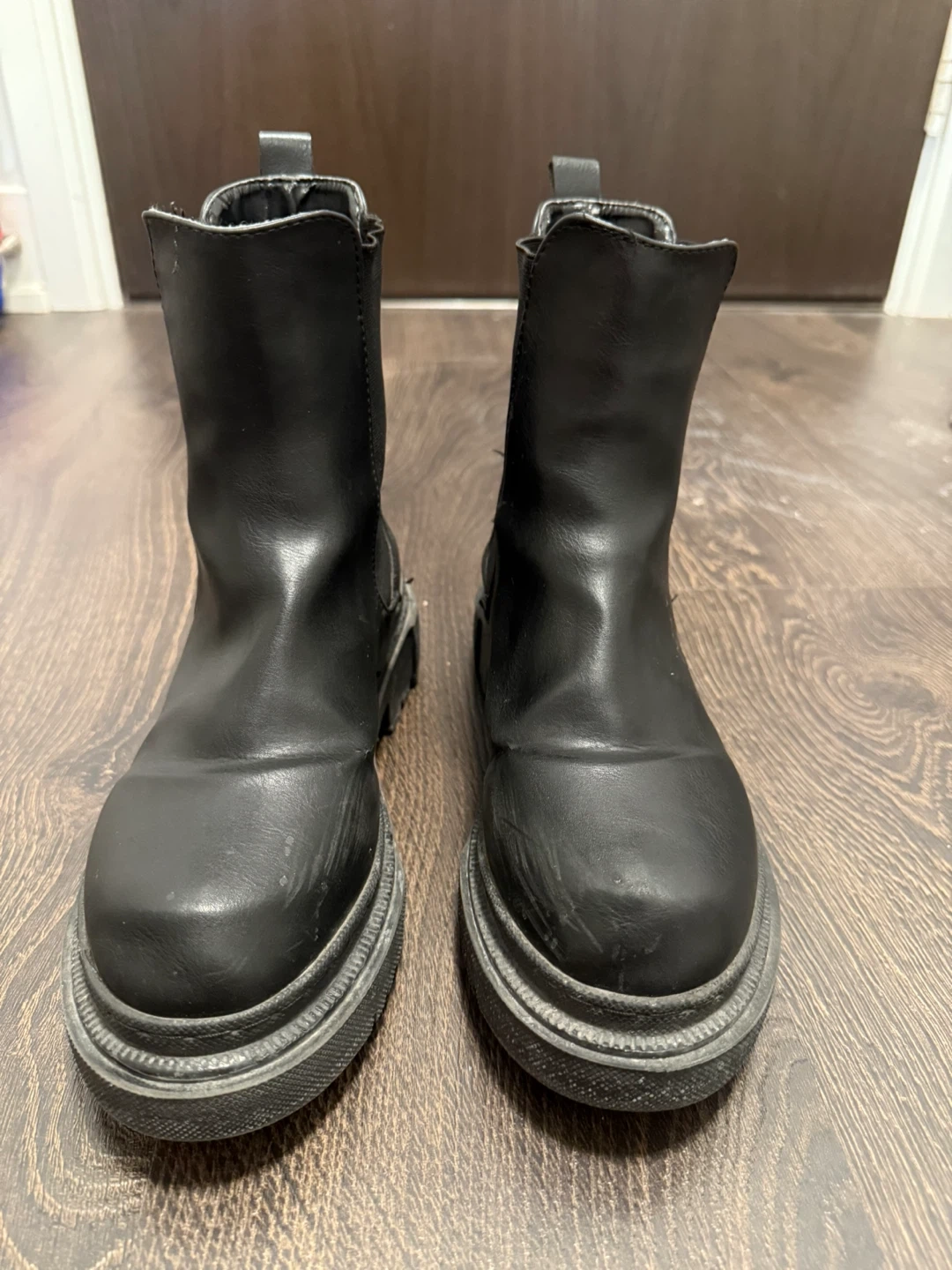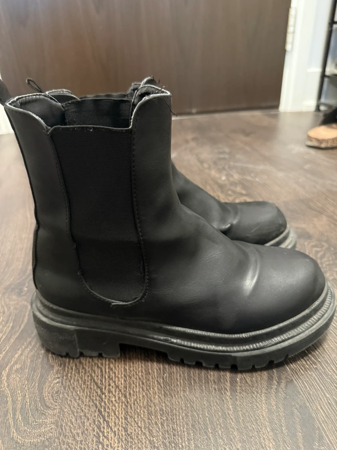 Selling a pair of black Chelsea boots. They show some signs of wear, as you can see in the photos, but still have lots of life left! A small tear on the right one as shown.