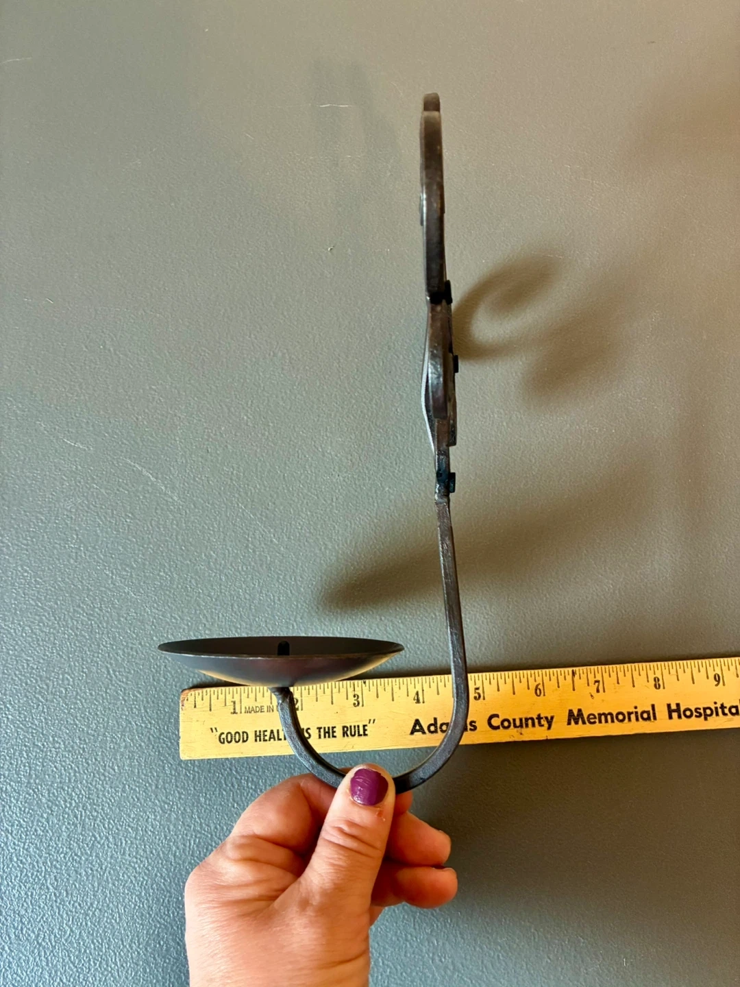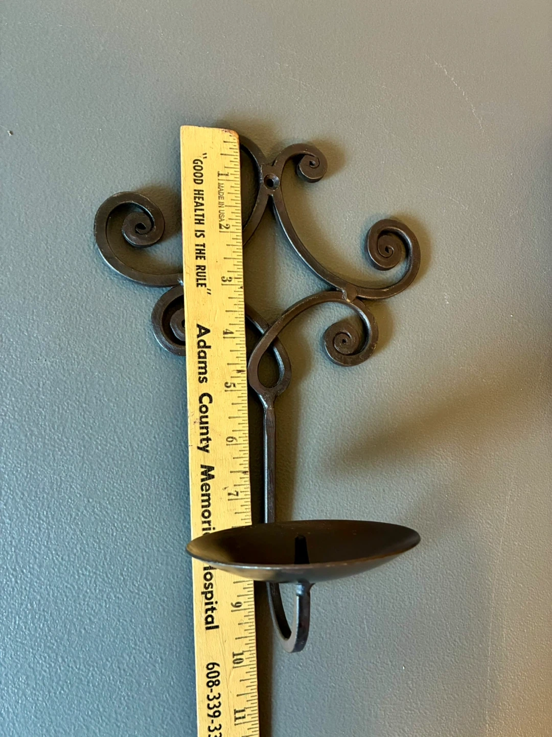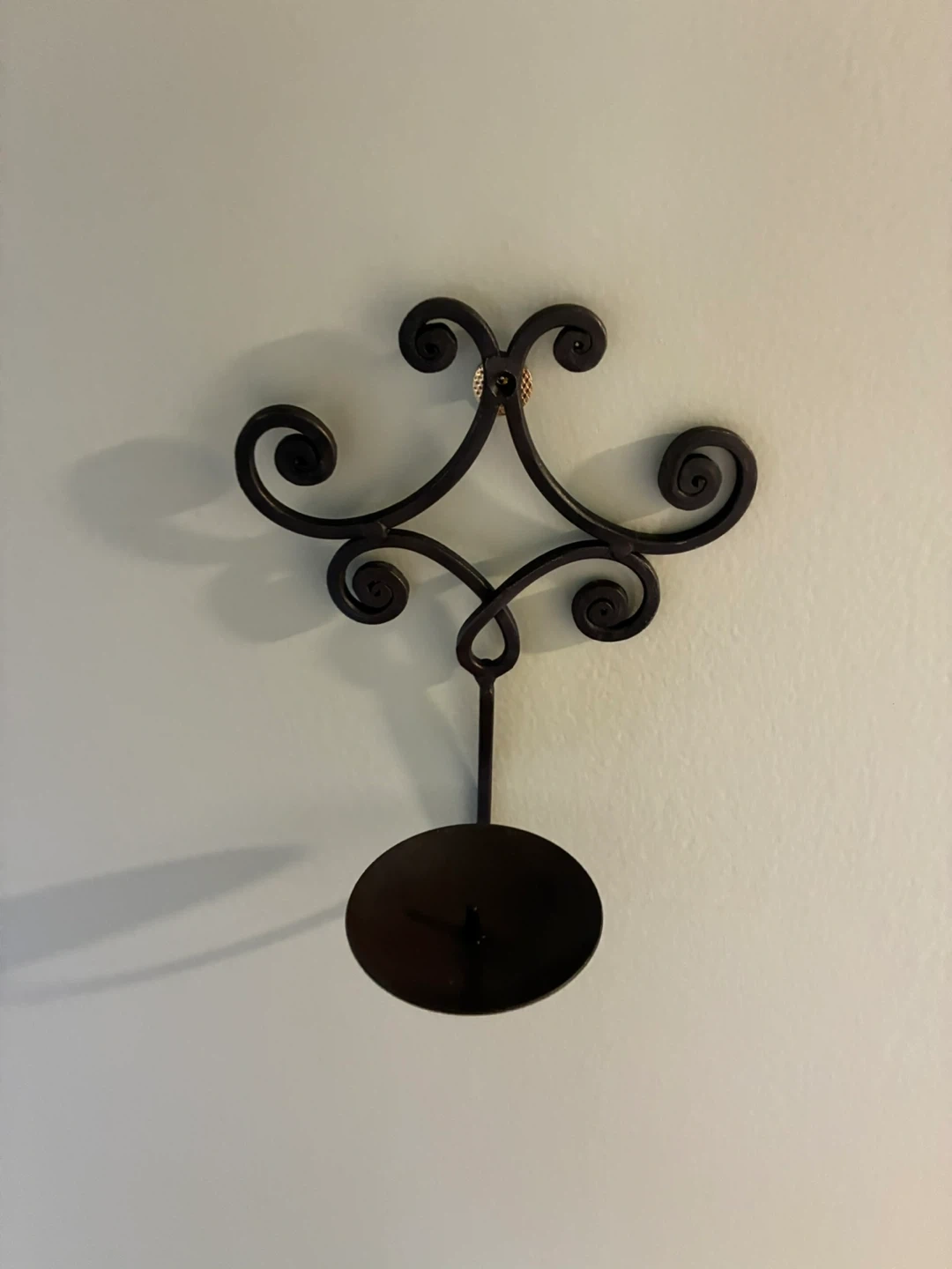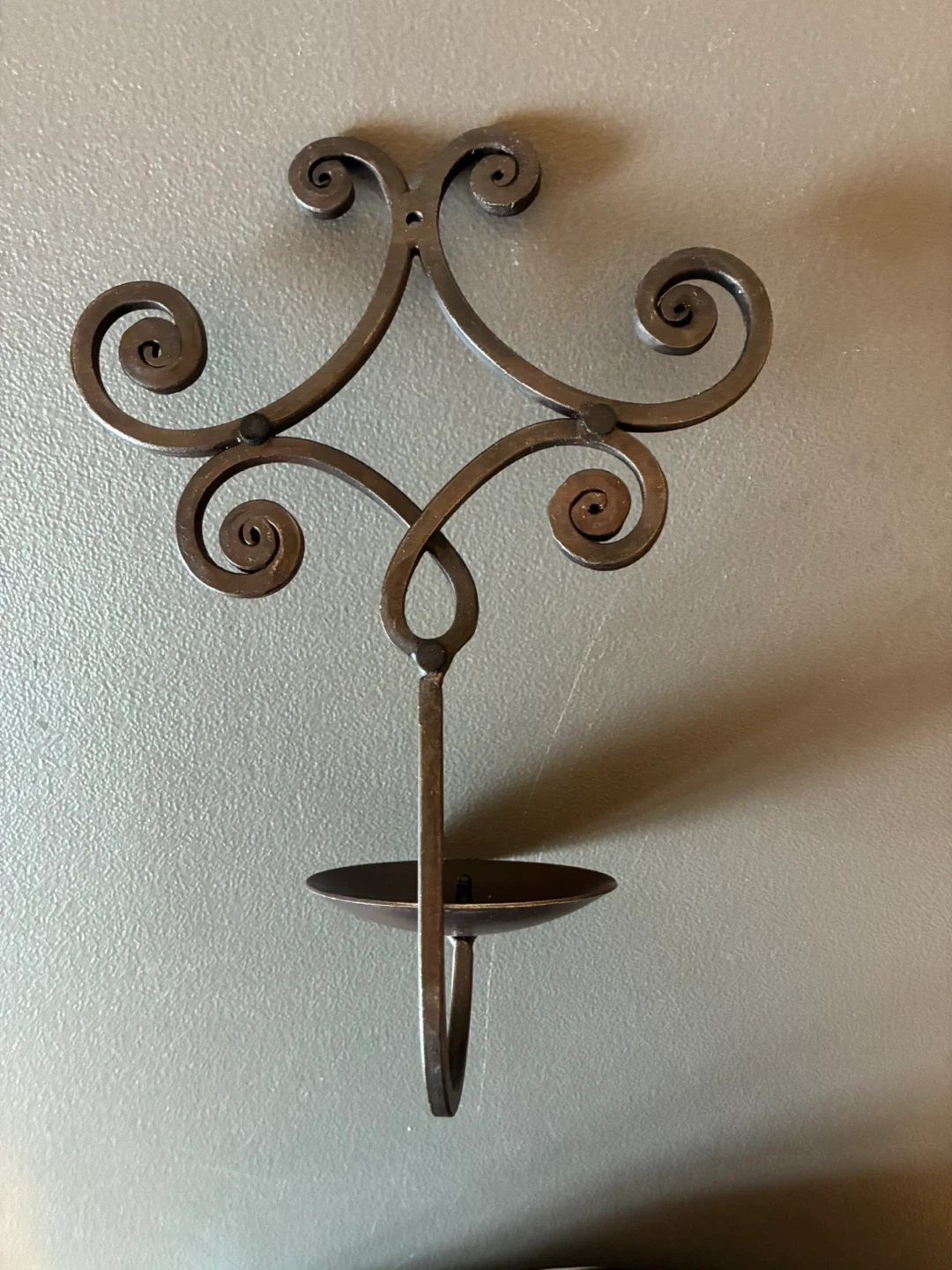 Decorative wrought iron wall candle sconce. Metal construction with a dark finish. It's designed to hold one taper candle. A lovely accent piece for your wall!