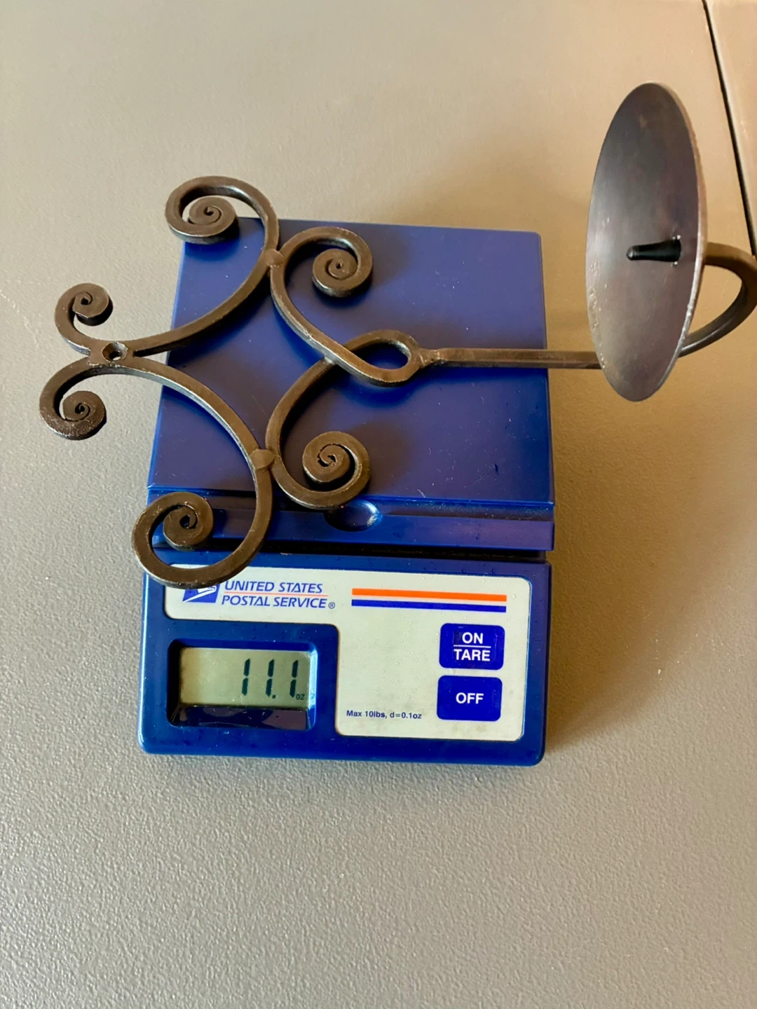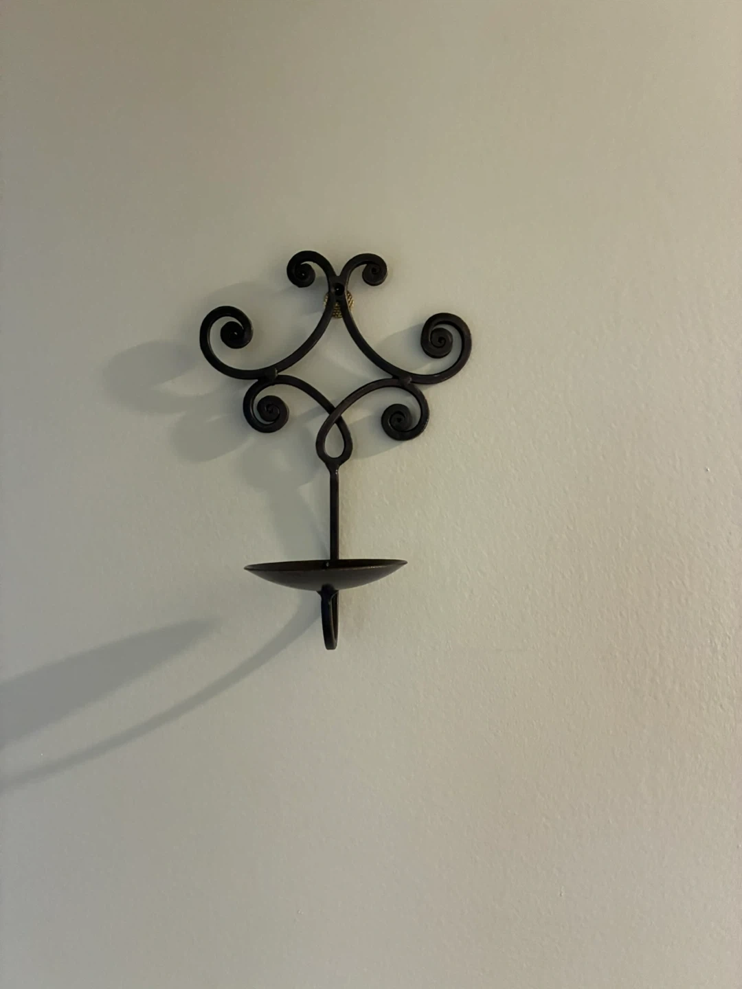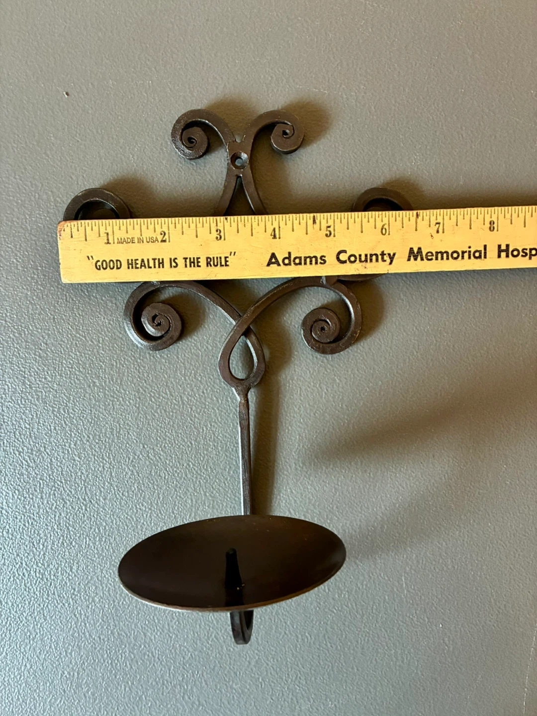 Decorative wrought iron wall candle sconce. Metal construction with a dark finish. It's designed to hold one taper candle. A lovely accent piece for your wall!