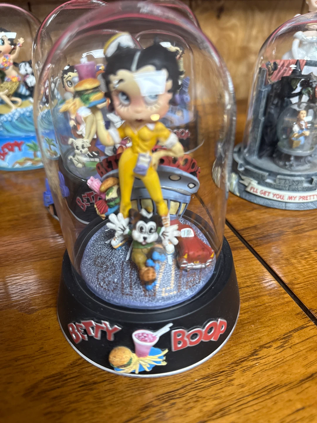 This Betty Boop figurine is housed in a clear dome, depicting a diner scene. It features Betty Boop in a yellow outfit with a burger. The base has the 'Betty Boop' logo and miniature fries and a drink. A fun collectible for fans!