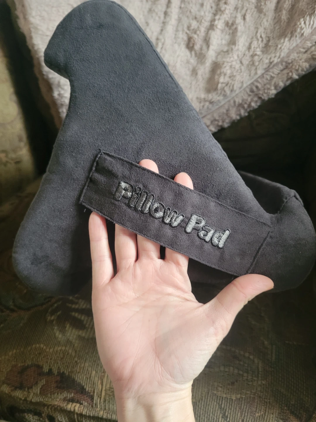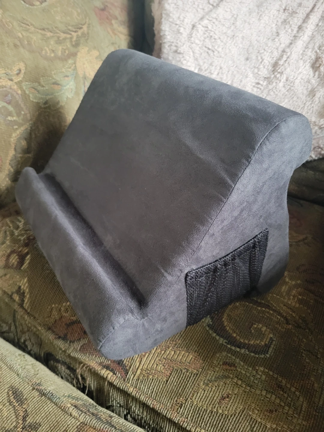 A dark grey Pillow Pad tablet stand. It's made of soft fabric and holds your tablet while you relax. Perfect for hands-free viewing on the couch or in bed!