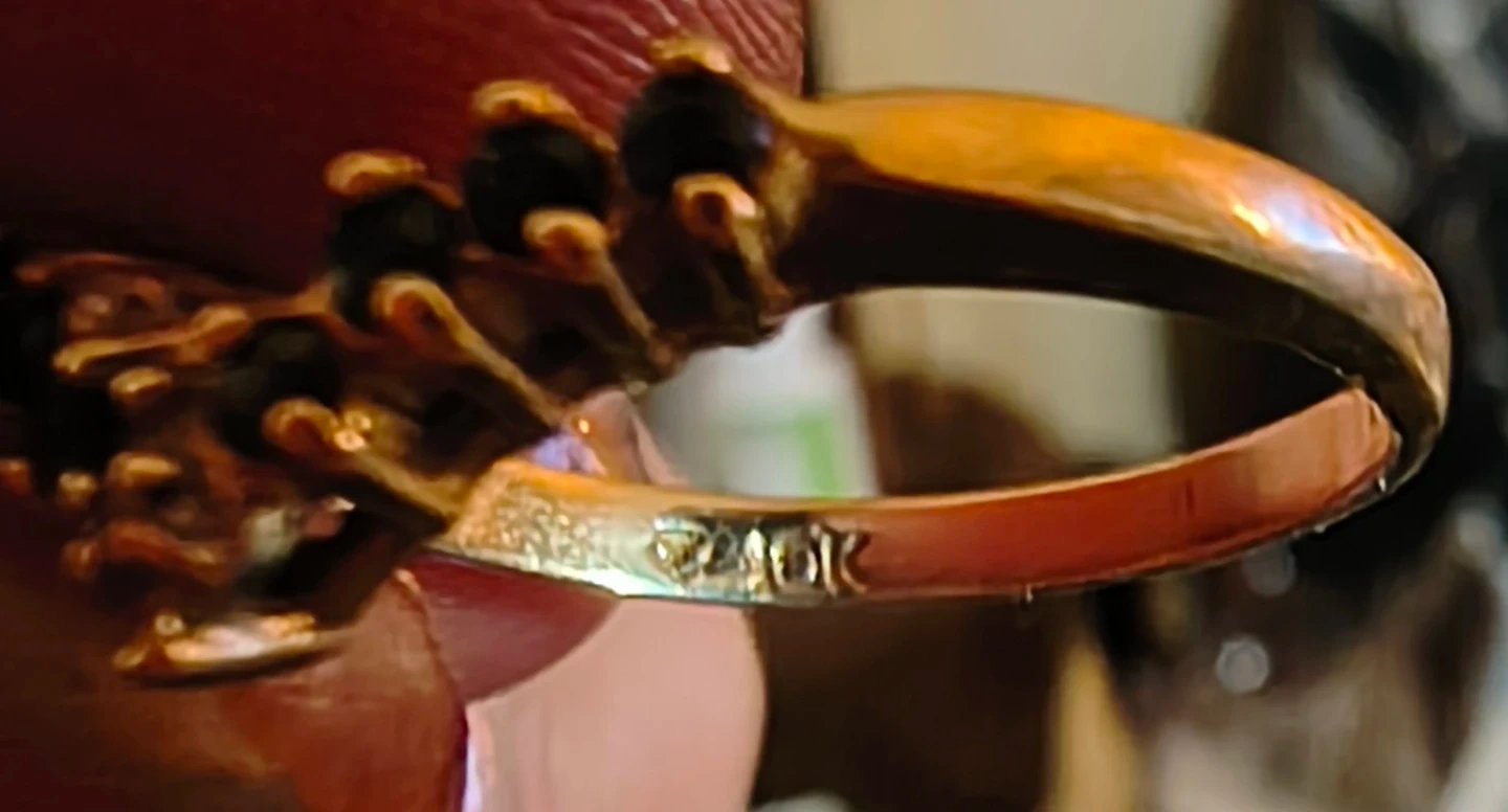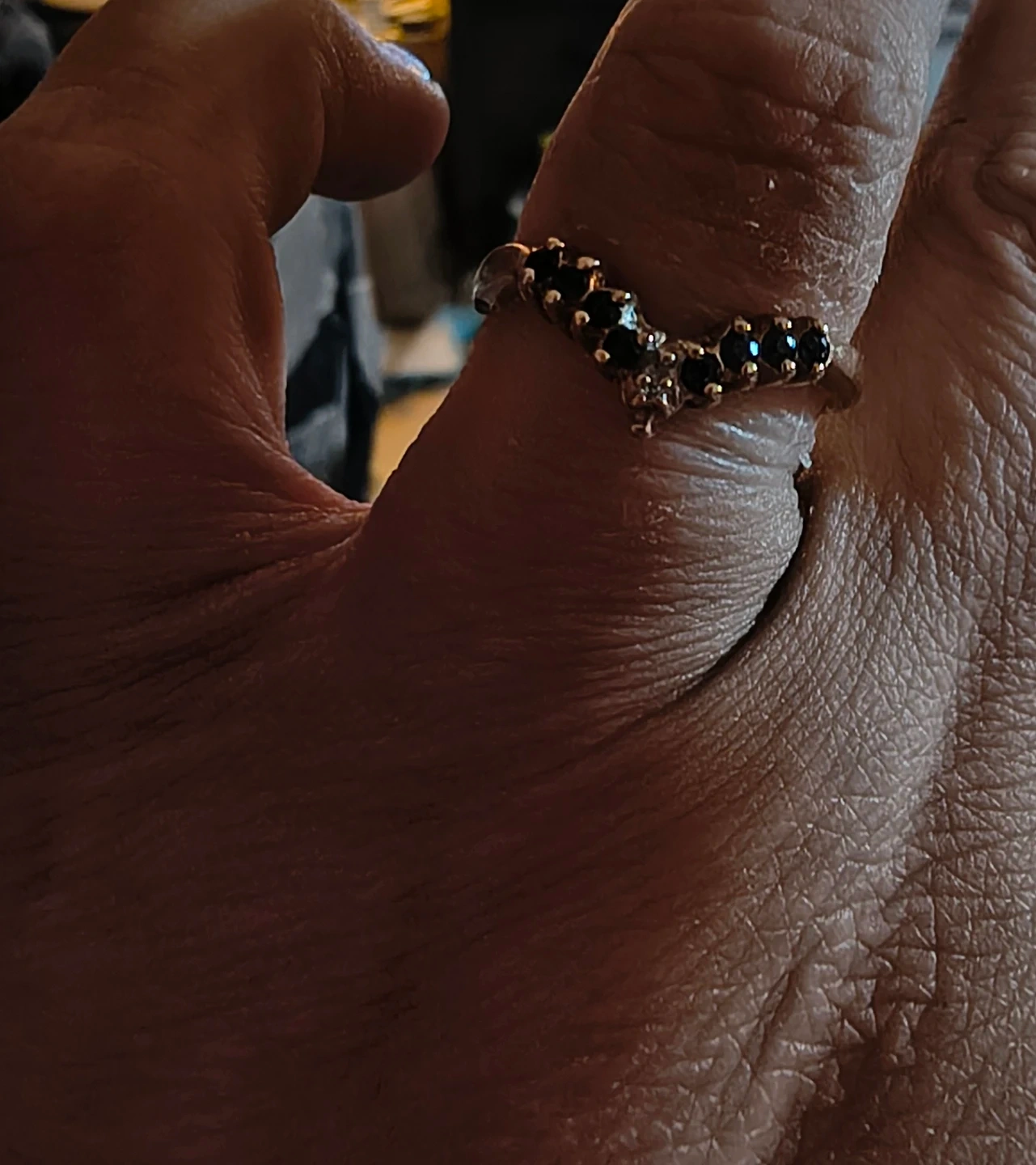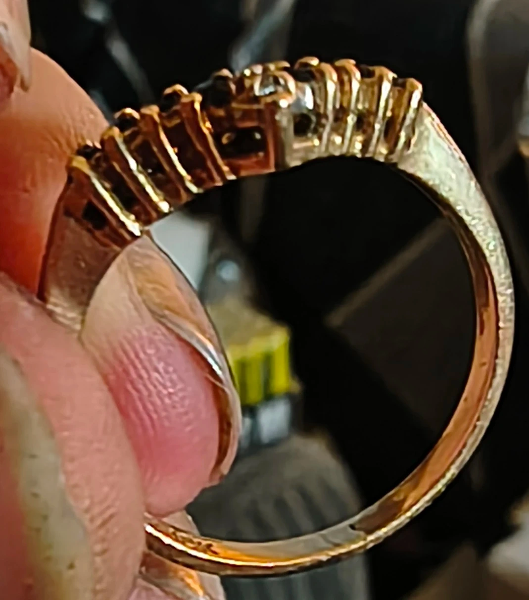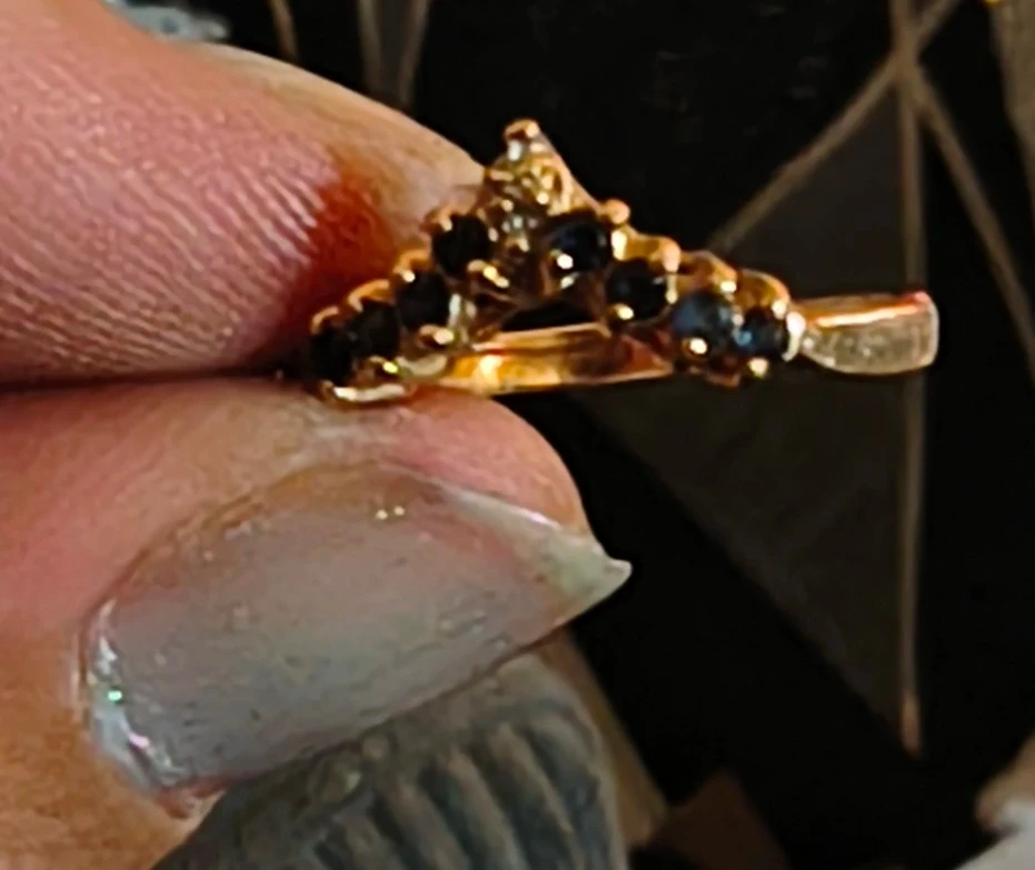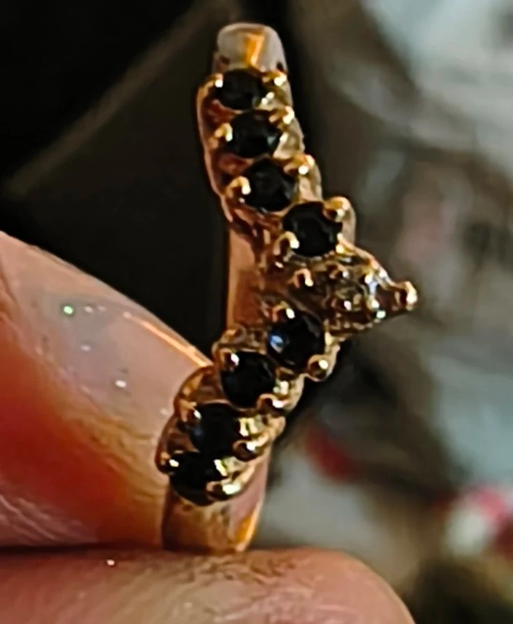 Beautiful 10k gold ring with a chevron design set with small blue sapphire stones. It has a lovely sparkle. 10k stamped on the band.