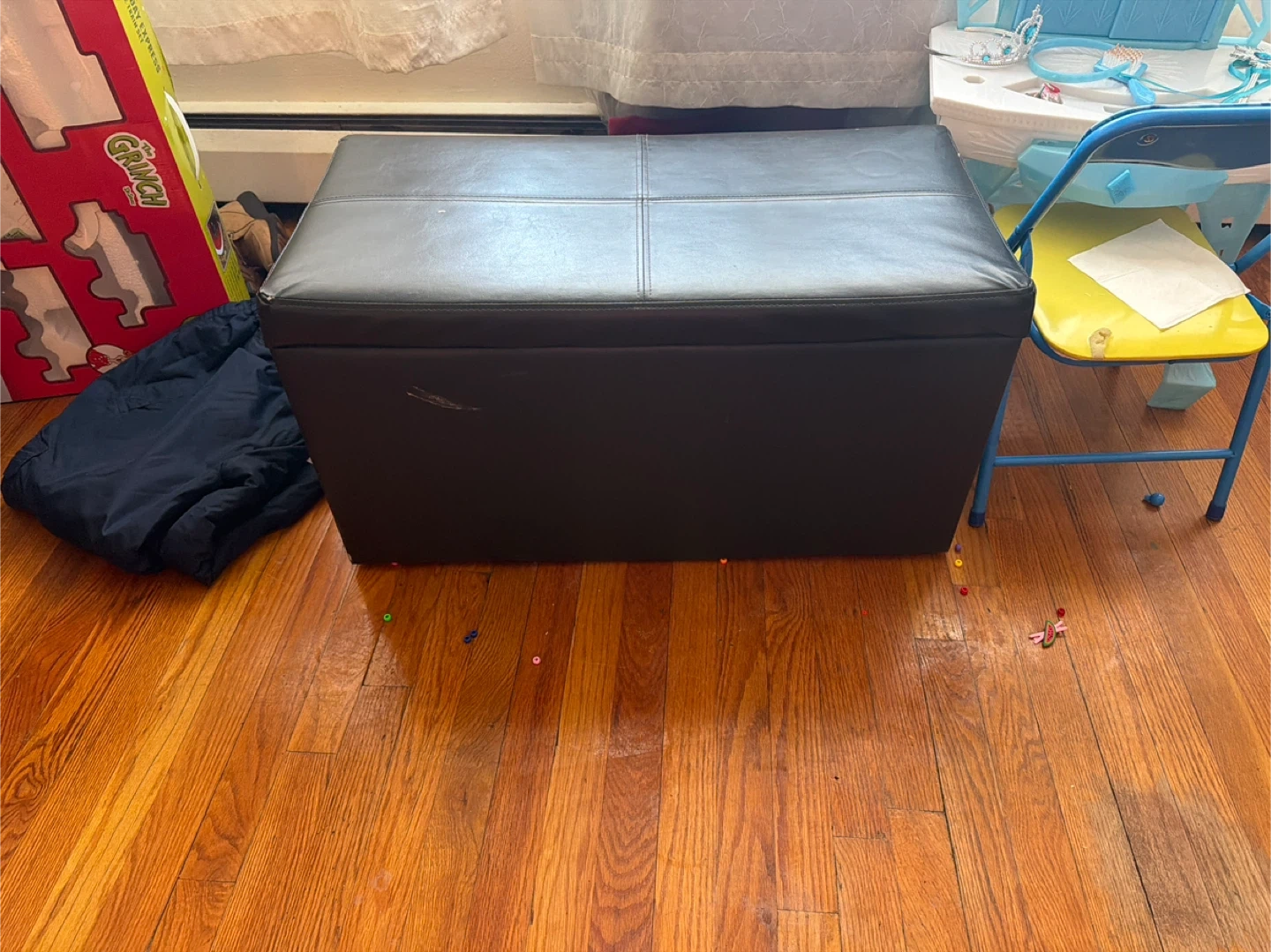 This storage ottoman is upholstered in dark brown faux leather. It features a hinged lid for easy access to the storage space inside. It's a useful piece for keeping living areas tidy!