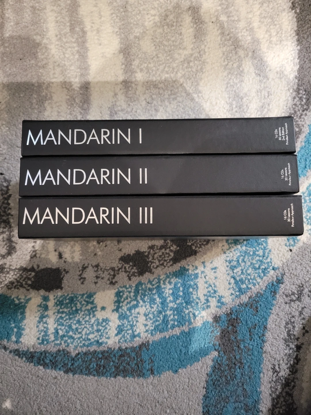 This set includes Mandarin I, II, and III from the Pimsleur Approach Gold Edition. Each level comes with CDs and lesson books. It's a comprehensive way to learn Mandarin.