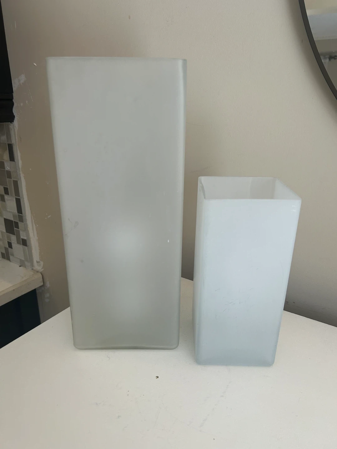 Two frosted glass lamps , one tall and one short. They're perfect for adding a touch of modern decor to any room. Glass material.