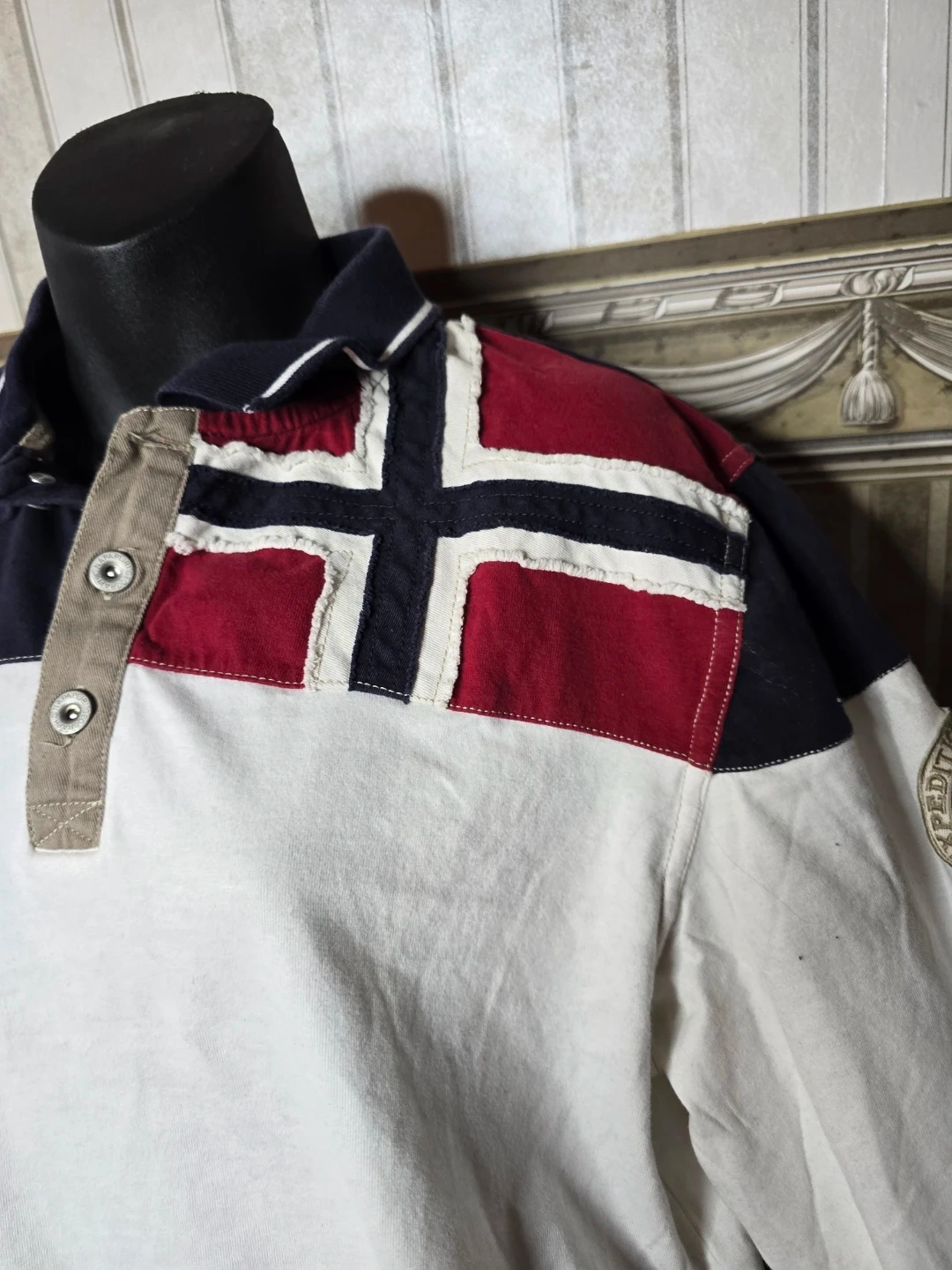 This is a Napapijri long-sleeve rugby shirt. It features a multi-panel design with red, white, and navy blue sections, including a Norway flag motif on the shoulders. Cotton material.