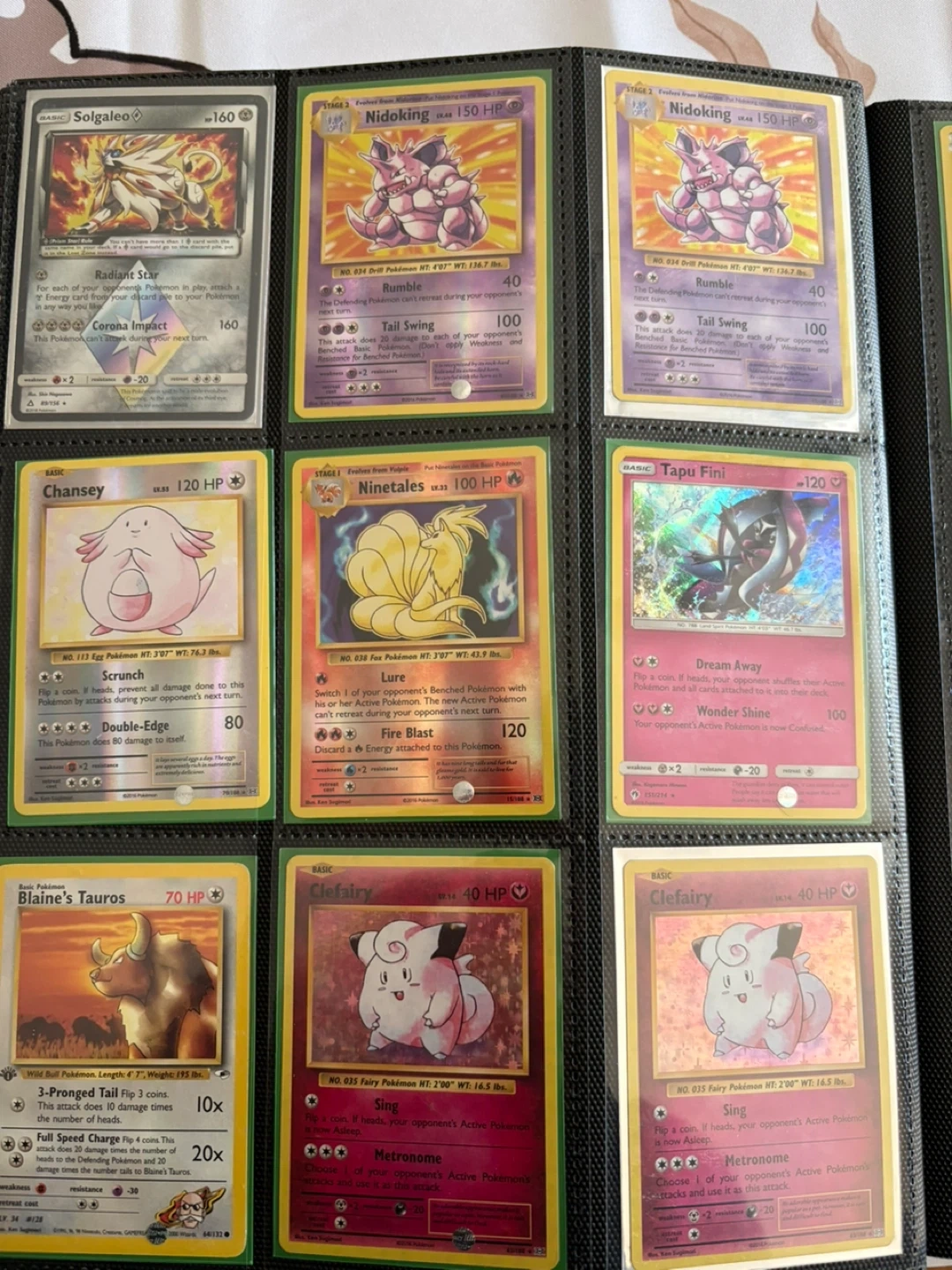 Collection of assorted Pokémon cards. Features a variety of Pokémon like Solgaleo, Nidoking, Chansey, Ninetales, and more. Great for collectors!
