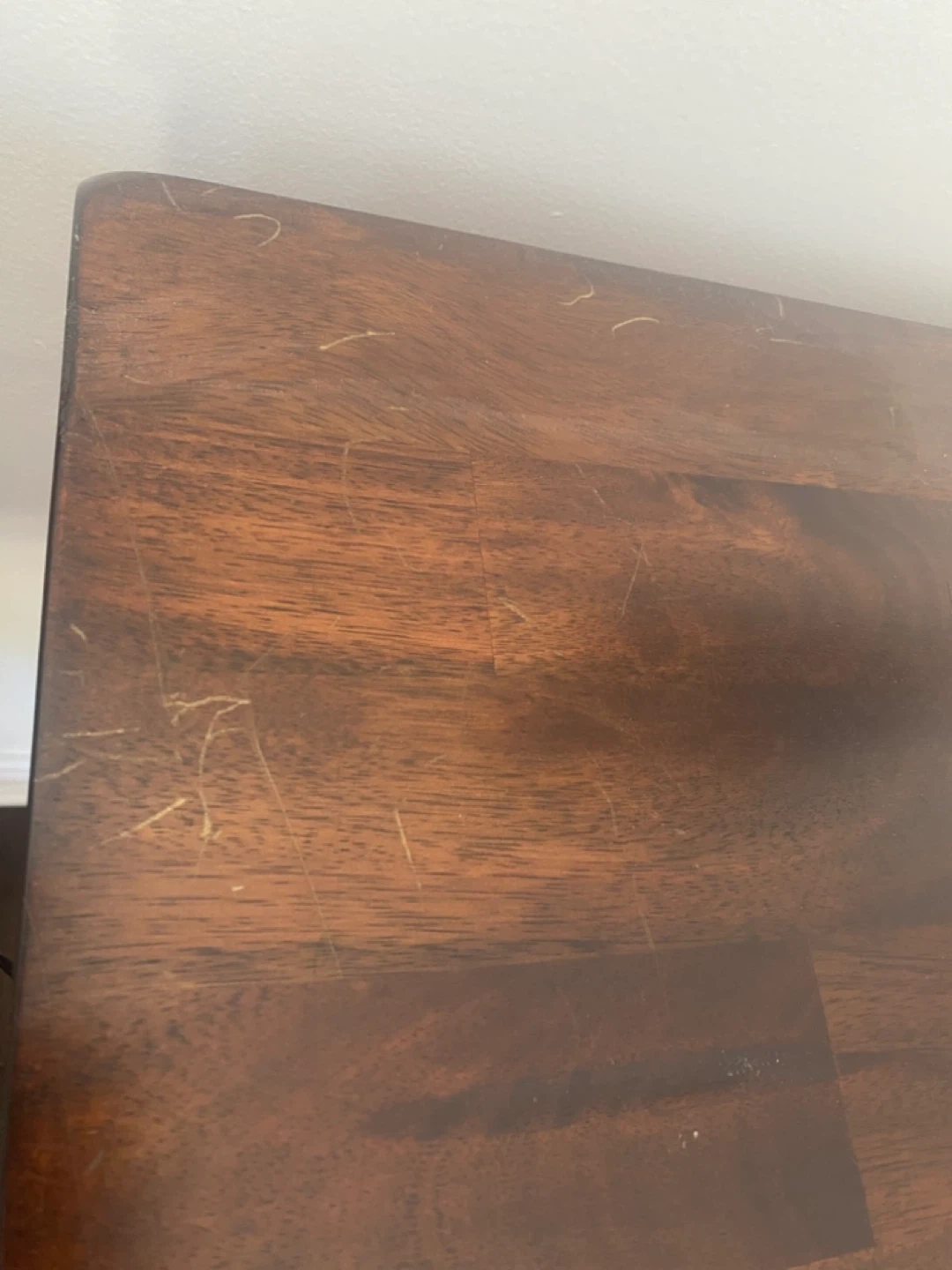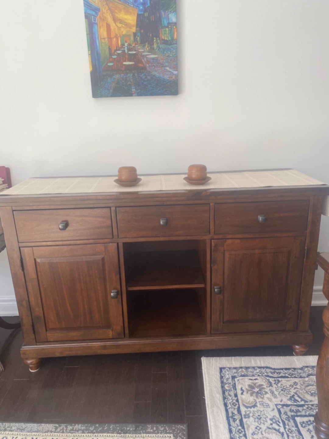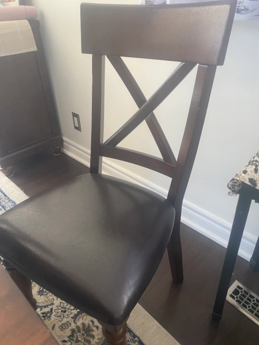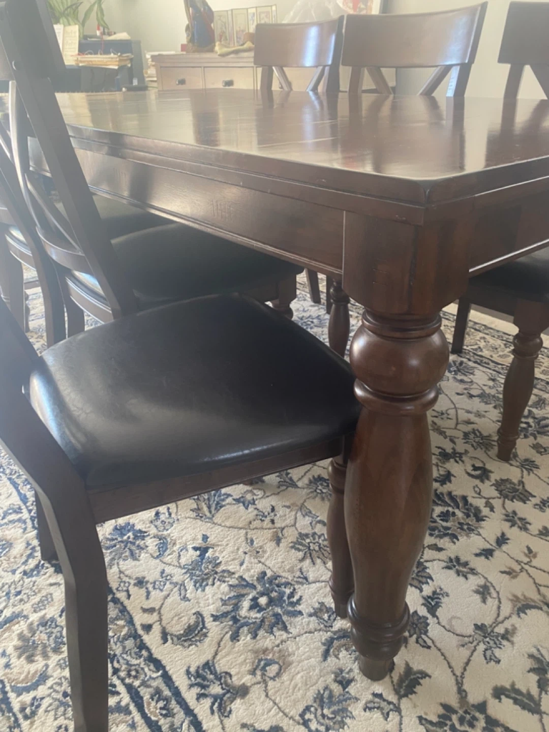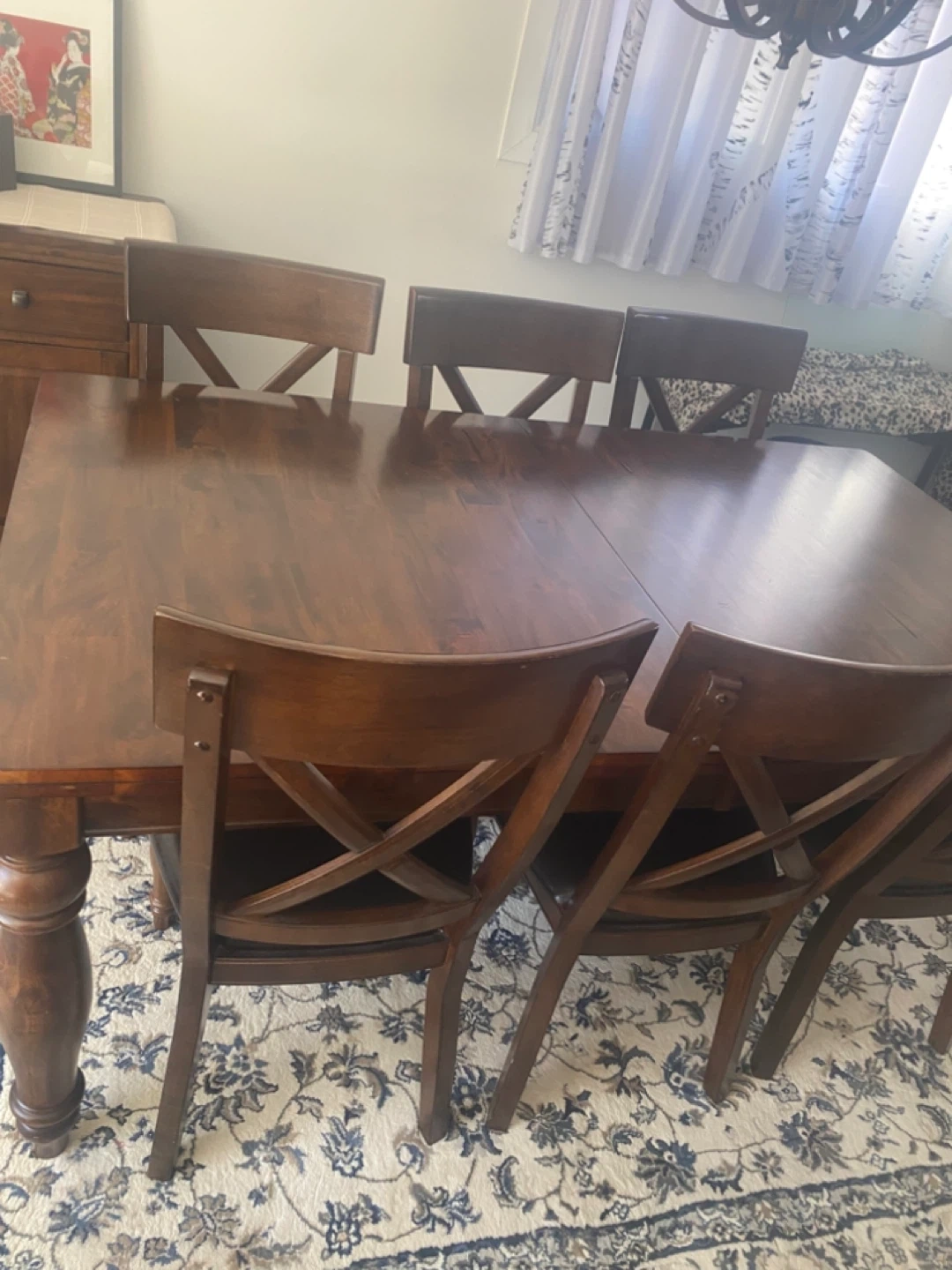Dark wood server/buffet, dining table with 6 chairs. Chairs have black upholstered seats and a distinctive 'X' back design. Buffet has some surface scratches. pet free non smoking house.