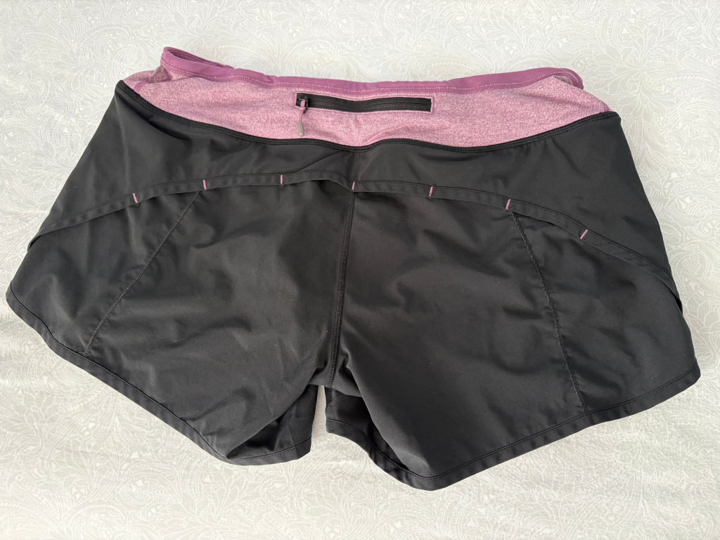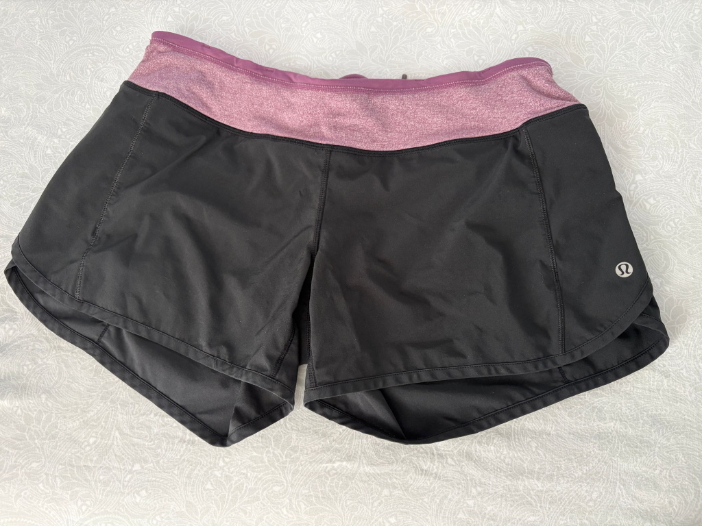 Selling a pair of Lululemon running shorts in black, with a purple accent waistband They're in great condition.
