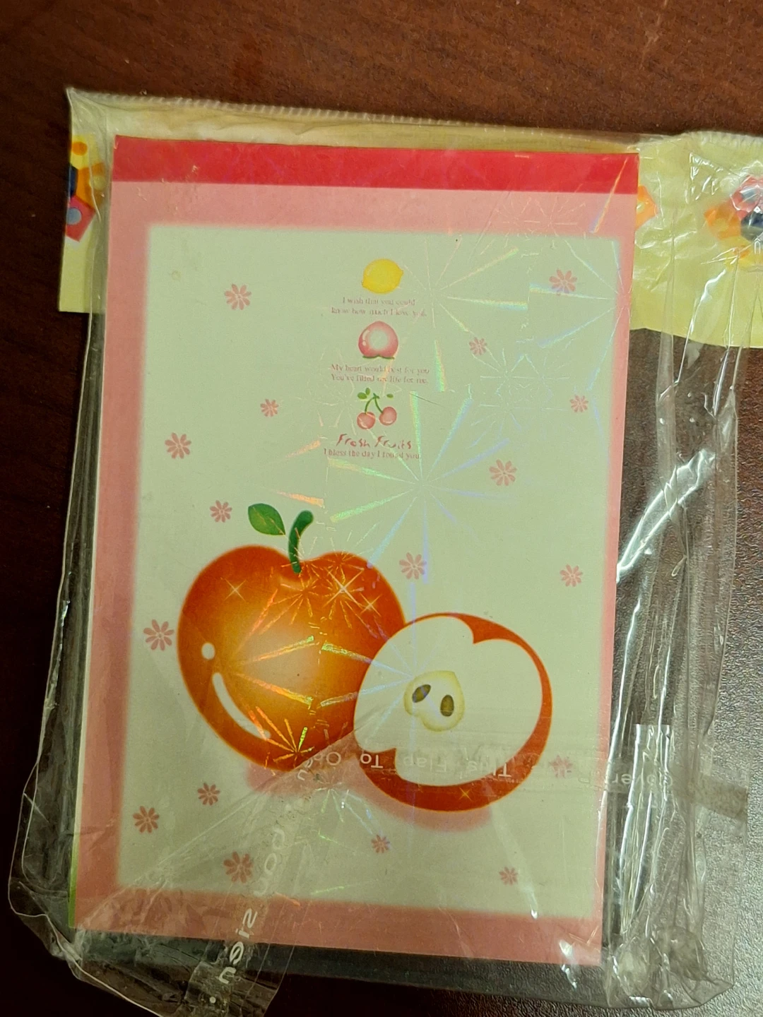 This is a stationery set featuring a cheerful apple design and small fruit accents. It includes writing paper and envelopes. It's perfect for sending short notes or for journaling.