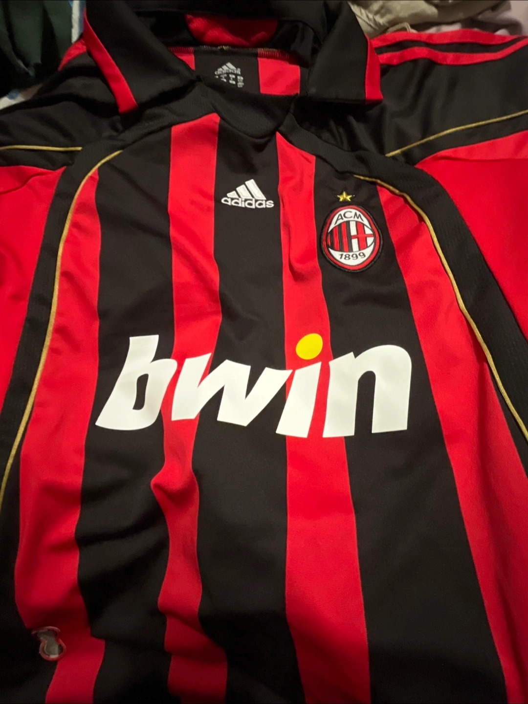 Selling an Adidas AC Milan soccer jersey featuring KAKA and the number 22. The jersey has the AC Milan logo and the Bwin sponsor logo on the front. It's a red and black striped design.