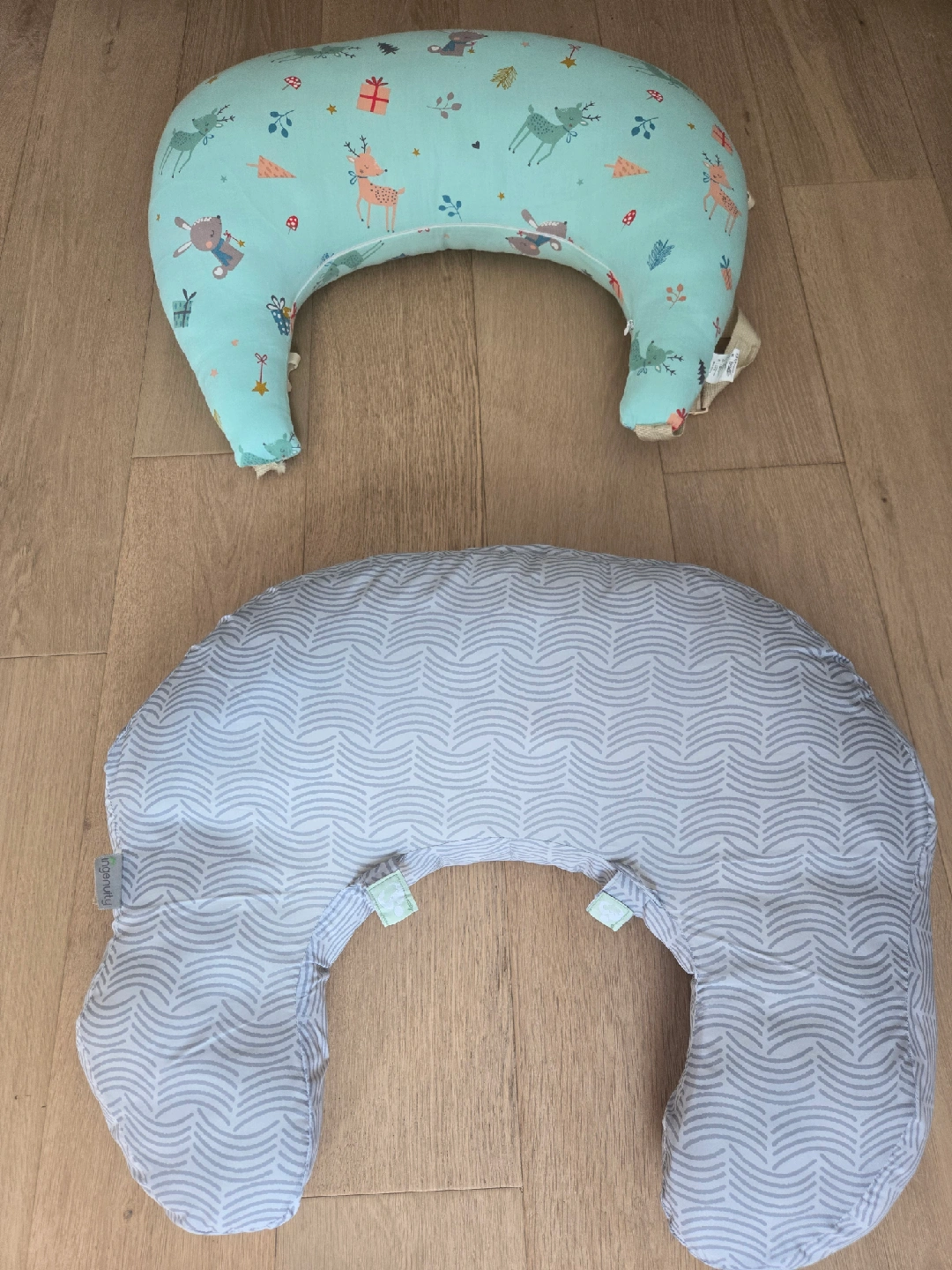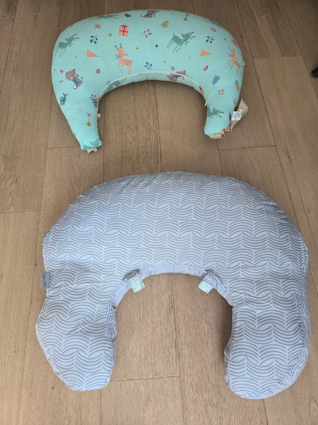 Selling two Boppy nursing pillows. One has a cute deer and gift pattern on a light blue background. The other has a grey and white chevron pattern. Both are in great condition and ready for a new home!