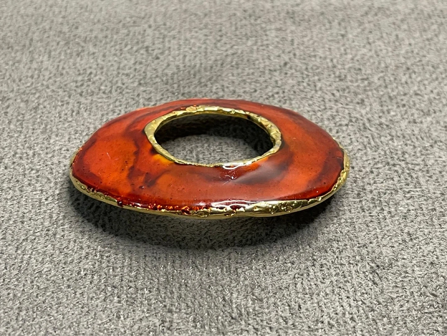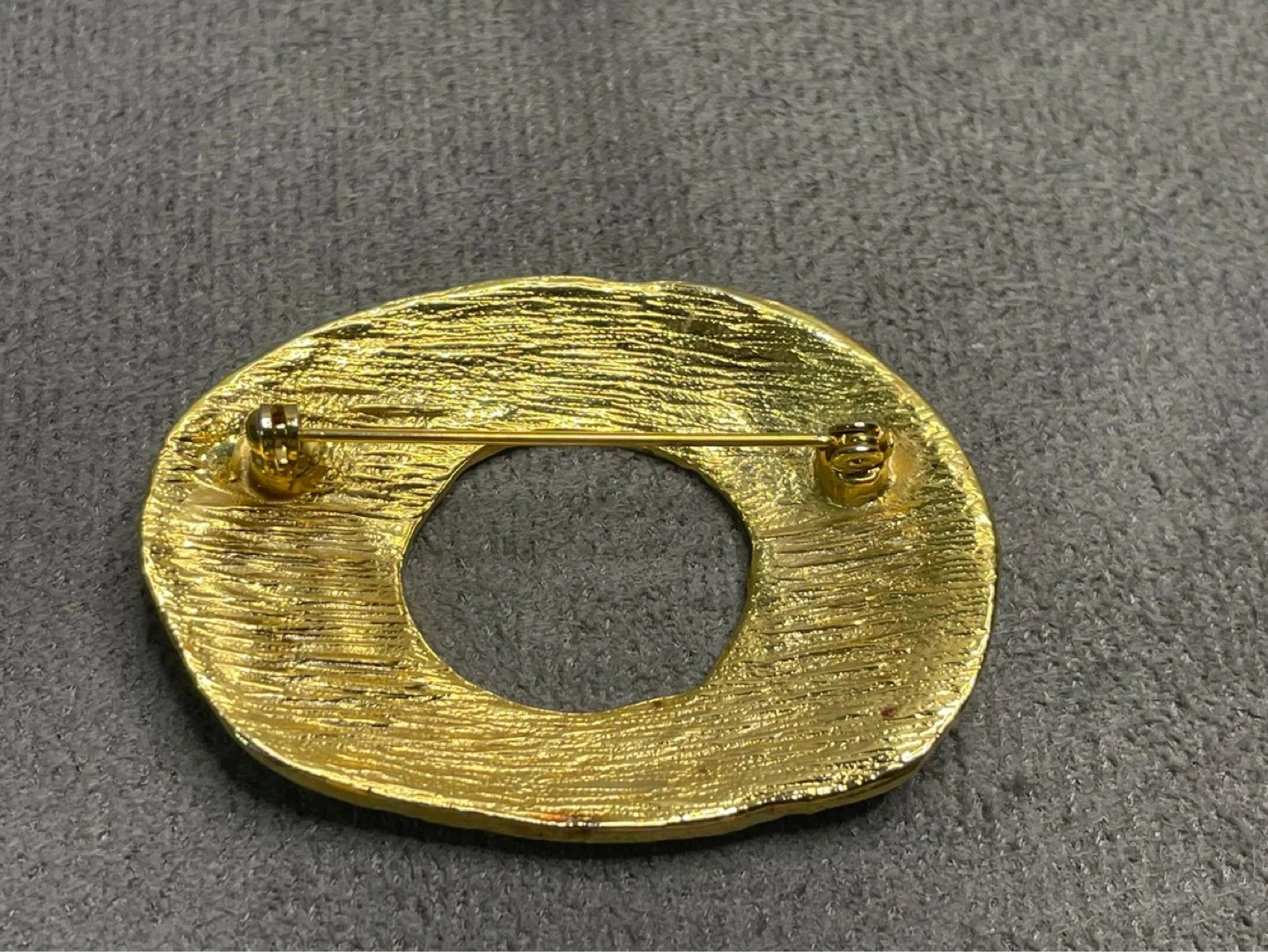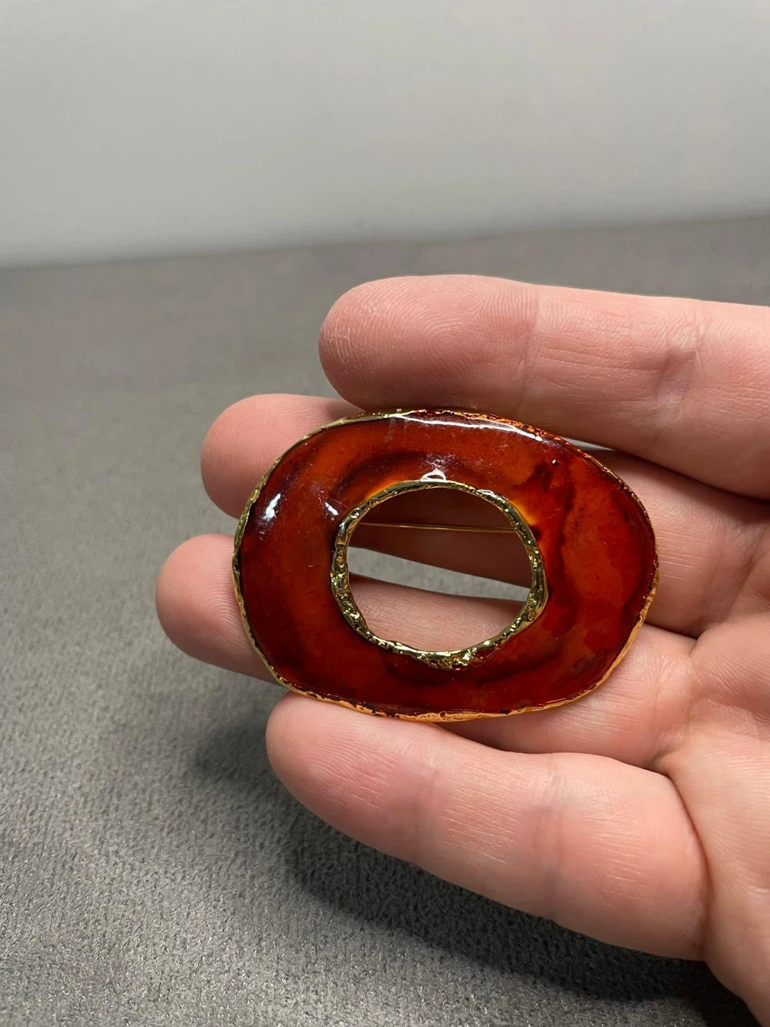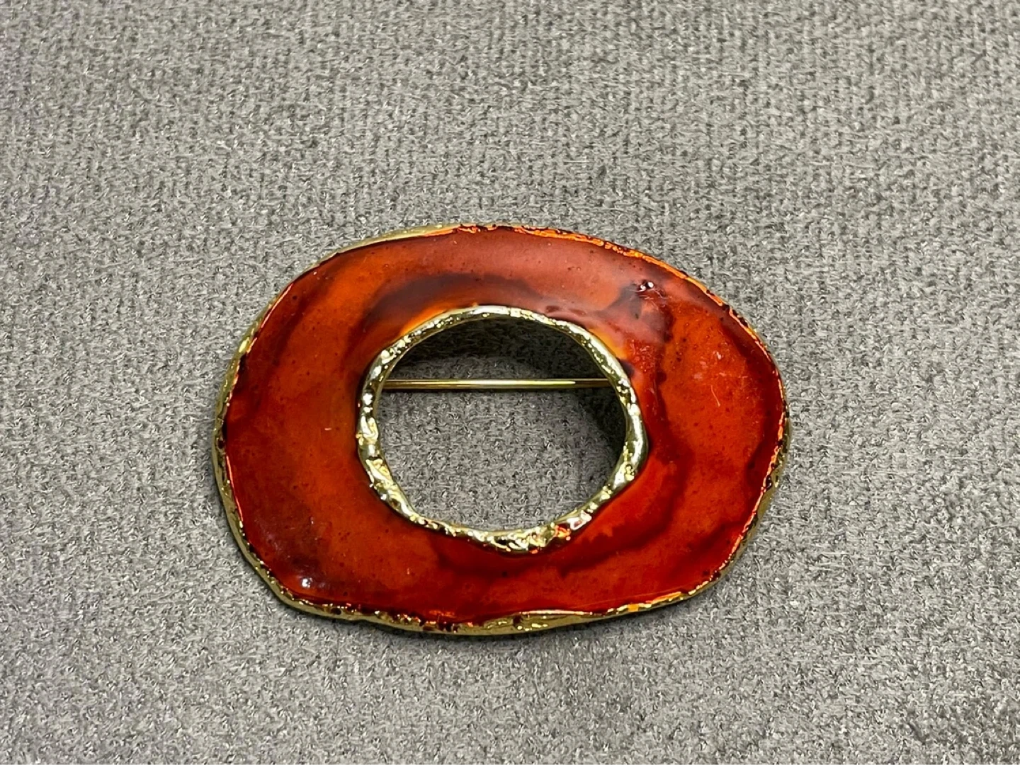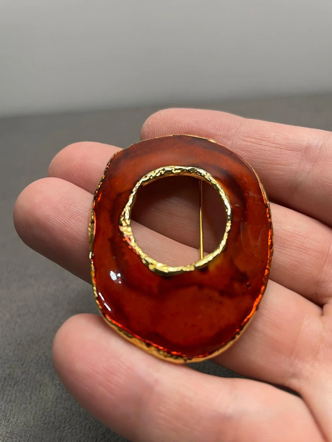 This unique brooch has a textured gold-tone metal frame with an orange enamel inlay. It measures approximately 5.5 cm in diameter. The backing features a secure pin closure.