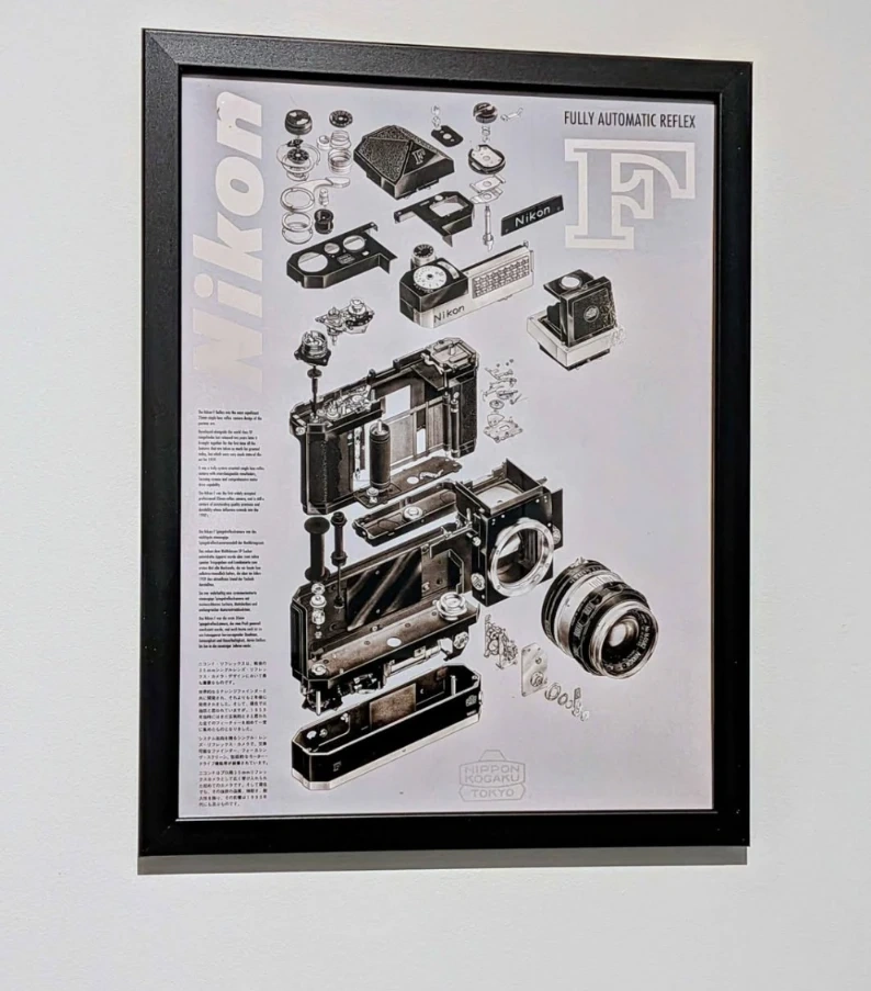 Framed poster showcasing the exploded view of a Nikon Fully Automatic Reflex F camera. Includes detailed diagrams of internal components. 'Nippon Kogaku Tokyo' is also visible.