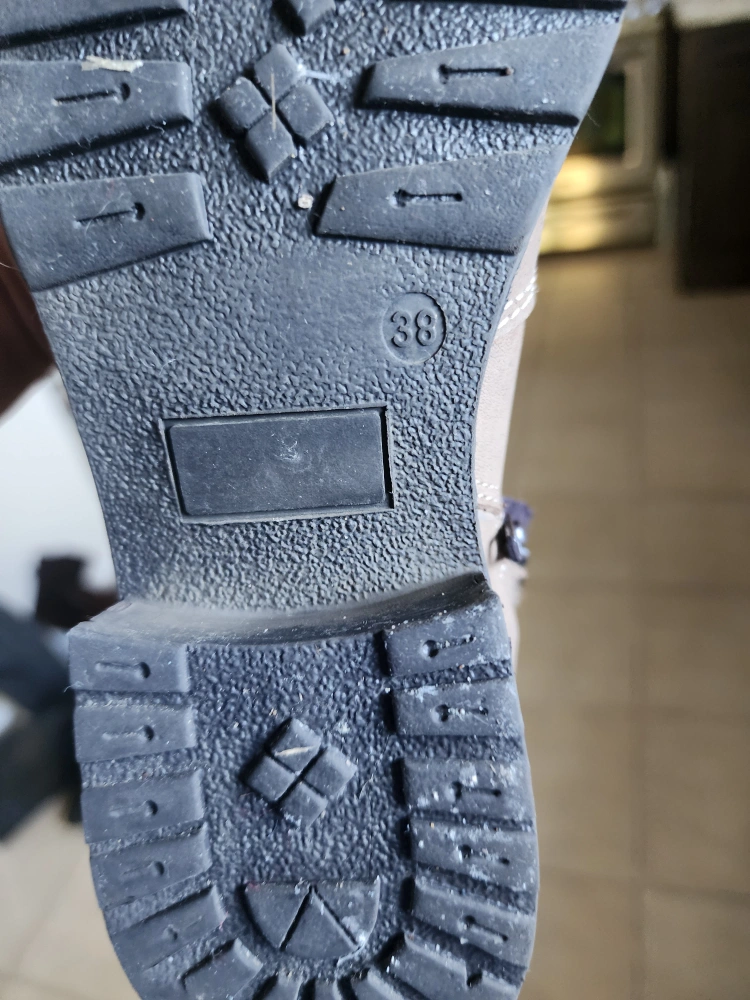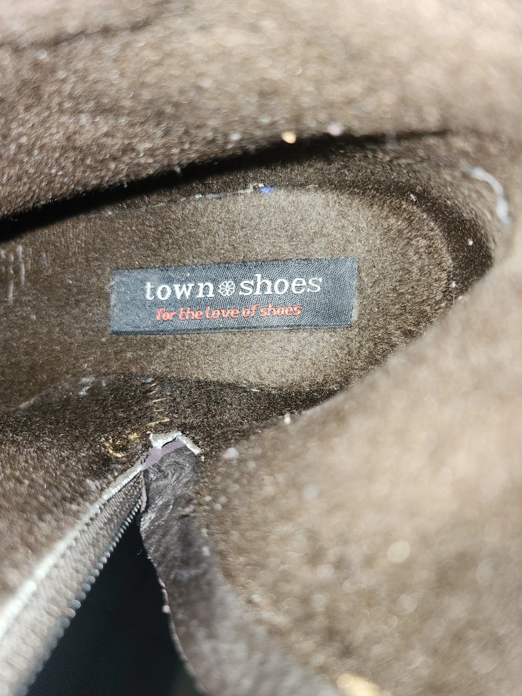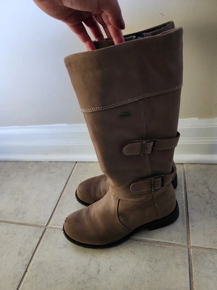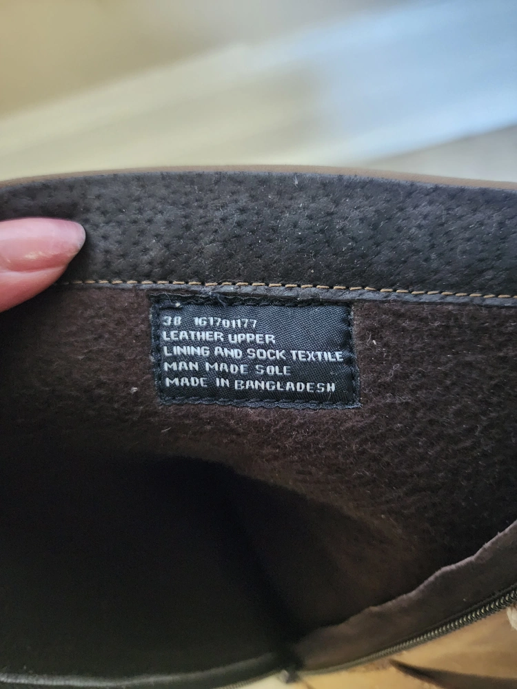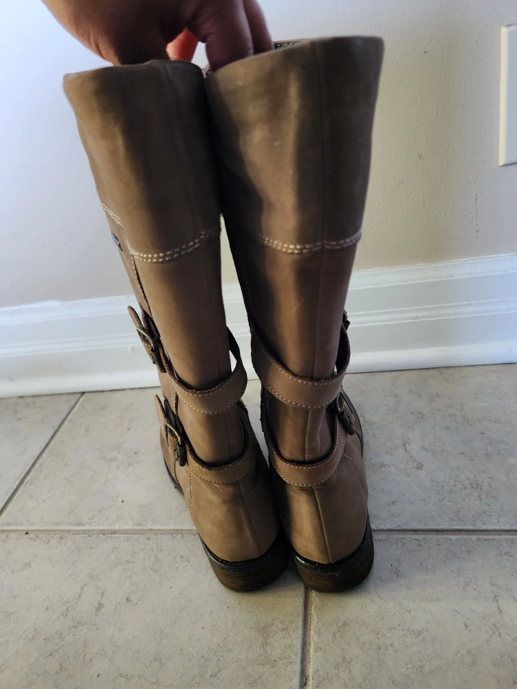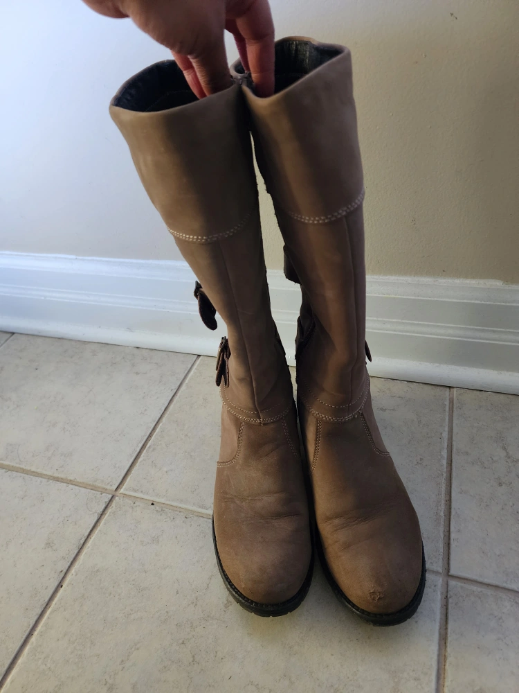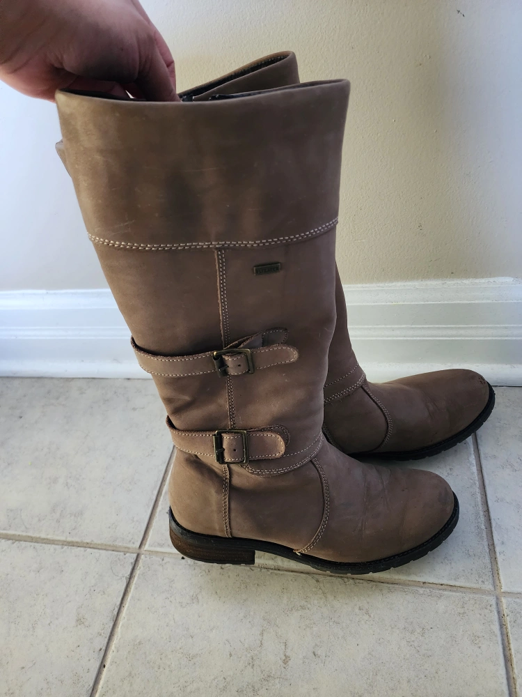 Pair of women's brown leather boots. Features double buckles and a zipper. Size EU 38. Barely used