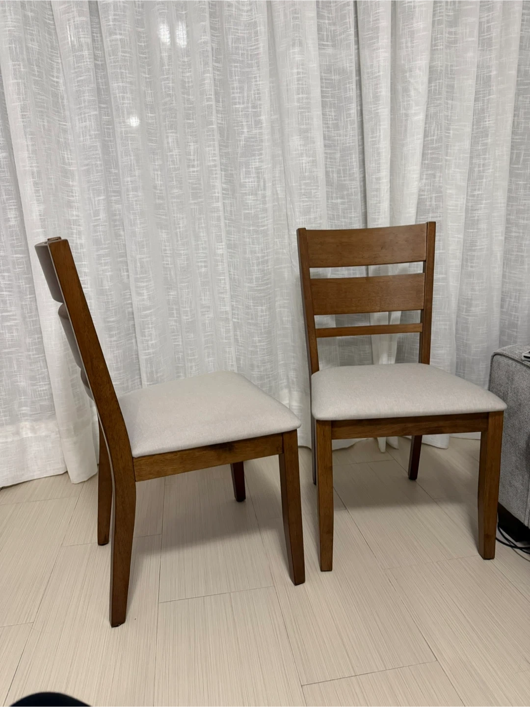 Selling a set of two wooden dining chairs. Each chair has a comfortable upholstered seat in a neutral tone. The wood has a warm, rich finish. They're great for adding extra seating to a dining area!