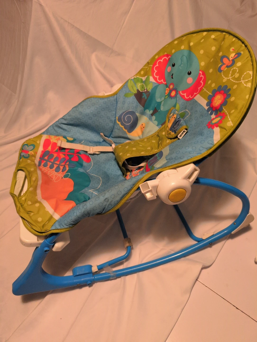 Fisher-Price baby bouncer seat with a colourful, nature-themed print. It comes with a removable toy bar featuring a frog and other hanging toys. The seat has a 3-point harness for safety. This bouncer is suitable for infants.