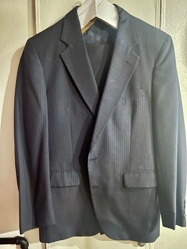 Stafford Navy Blue w Gray Pinstriped Wool Suit Pants. Two-piece suit, gray blue pin stripes, flat front design. Single-breasted cut, peak lapels. Jacket has a four-button sleeve button style. Size: 42R. Waist: 33 inches. Inseam: 29 inches. Feel free to message if you have any questions!