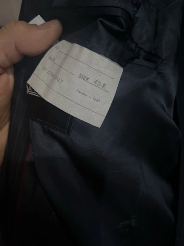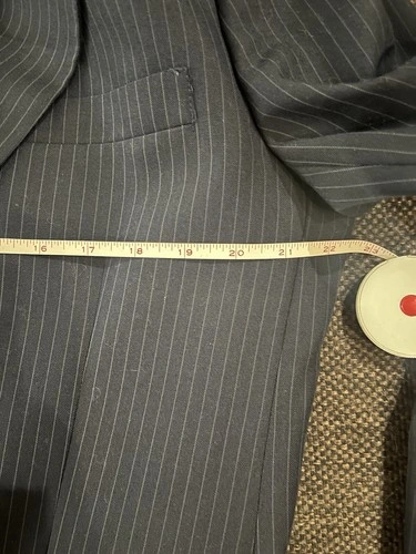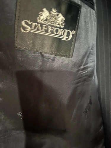 Stafford Navy Blue w Gray Pinstriped Wool Suit Pants. Two-piece suit, gray blue pin stripes, flat front design. Single-breasted cut, peak lapels. Jacket has a four-button sleeve button style. Size: 42R. Waist: 33 inches. Inseam: 29 inches. Feel free to message if you have any questions!