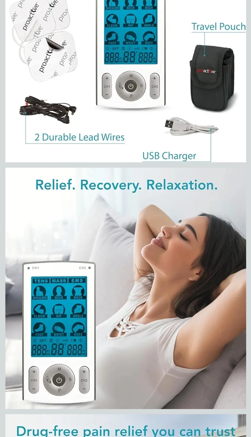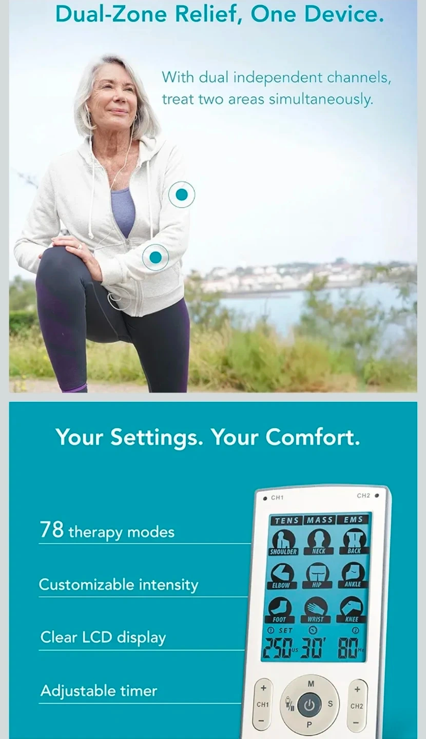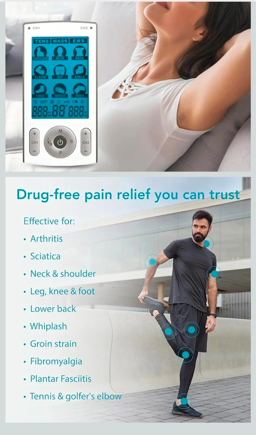 3-in-1 Therapy Modes: Offers TENS for effective pain relief, EMS for muscle strengthening and recovery, and massage mode to promote relaxation.