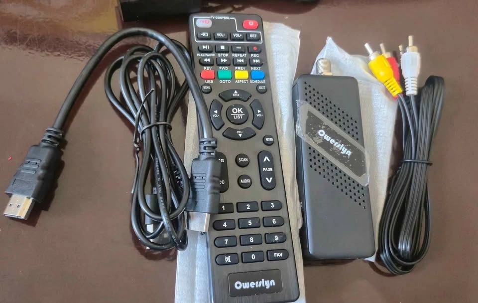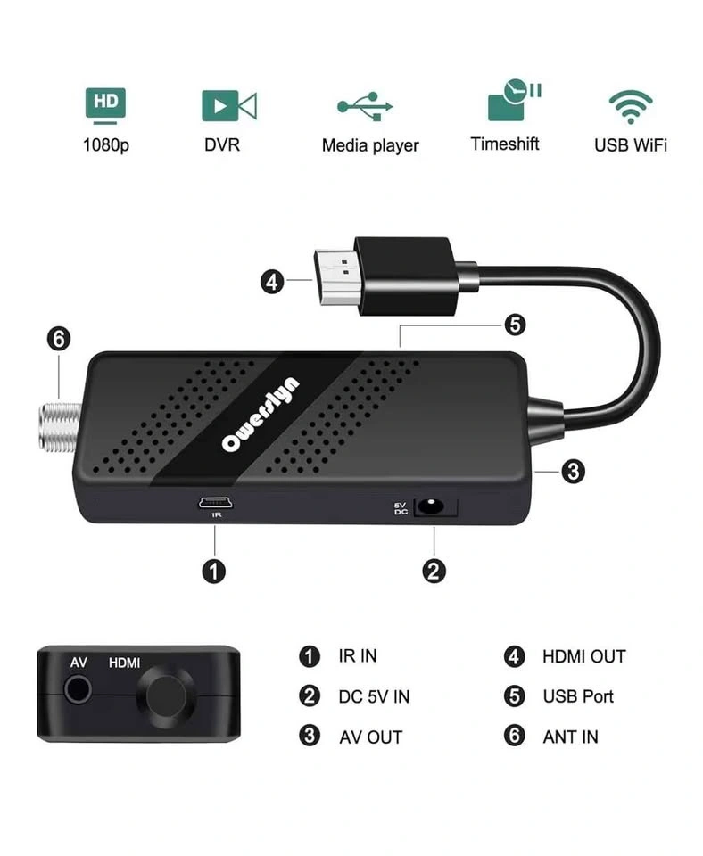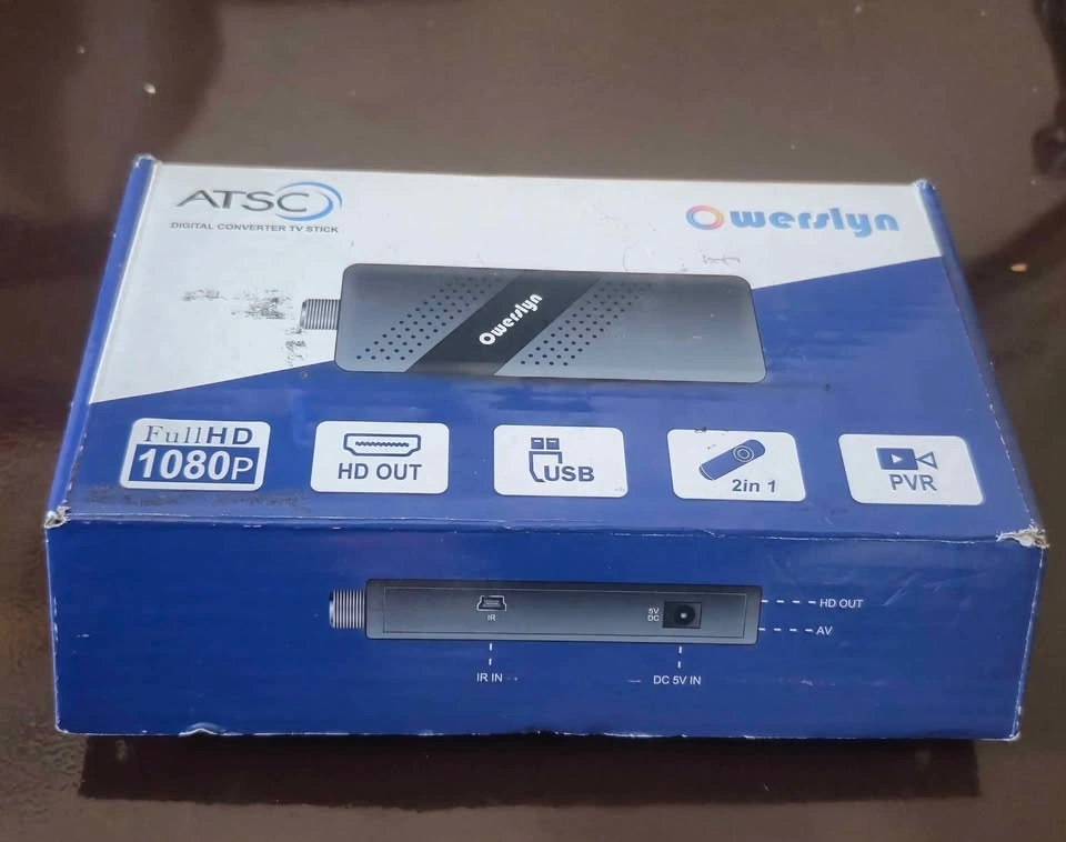 OWERSLYN 1080P Mini ATSC TV Tuner Box with TV program recording and playback, USB media player, HDMI/AV output, and 3RCA cables included. Feel free to message if you have any questions!