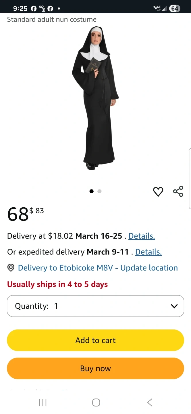 Buy & SellAdult Standard Nun CostumeAdult Standard Nun Costume$15This is an adult standard nun costume. It fits up to size 12. Includes the dress, veil and collar. - l only accept cash WHERE TO MEET2208 Lake Shore Blvd WView MapSELLERAmiraLakeshore23816 reviews0 chats·0 favorites·9 viewsSEND CHAT TO SELLERHi Amira! I’m interested in your listing.Hi Amira! I’m interested in your listing.Get the Karrot app to chatSign In to chat